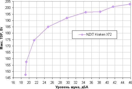 Приняв 25 дБА за критерий условной бесшумности, получим примерную максимальную мощность процессоров, соответствующих этому уровню, это порядка 185 Вт. Гипотетически, если не обращать внимания на уровень шума, пределы мощности можно увеличить еще где-то до 200 Вт. Еще раз уточним, это в жестких условиях обдува радиатора нагретым до 44 градусов воздухом, при снижении температуры воздуха указанные пределы мощности для бесшумной работы и максимальной мощности возрастают. В целом данная система является типичной по производительности в своем классе (на три вентилятора 120 мм или на два 140 мм).