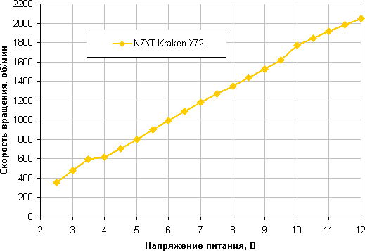 Изменение скорости вращения также плавное, но диапазон регулировки с помощью напряжения чуть-чуть шире. Вентиляторы останавливаются при 2,1/2,2 В, а при 2,4/2,5 В запускаются. Видимо, в случае необходимости их допустимо подключать к 5 В.