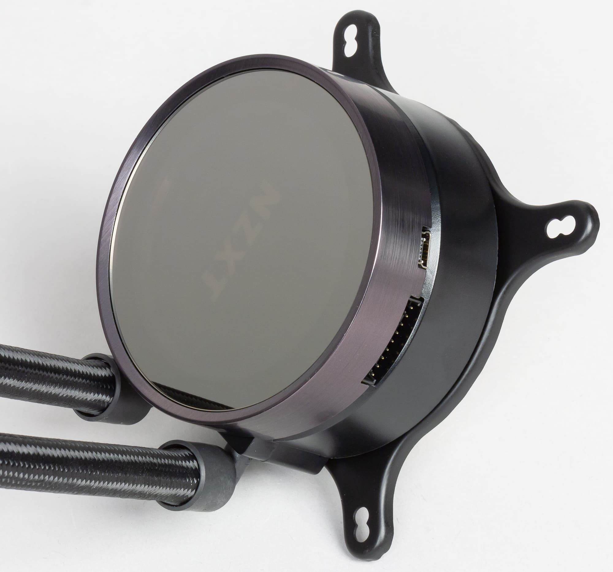 Кабель от помпы оснащен двухконтактным разъемом (общий и датчик вращения) на ответвлении длиной 21,5 см, который предлагается вставить в трех-/четырехконтактный разъем для процессорного кулера на мат. плате. Контакт датчика вращения в этом разъеме передает импульсы, частота которых соответствует скорости вращения помпы. Вентиляторы кулера оснащены четырехконтактным разъемом (общий, питание, датчик вращения и управление ШИМ) на конце кабеля длиной 40,5 см. Этот кабель имеет нескользкую декоративную оболочку. Вентиляторы подключаются к ответным разъемам на кабеле, выходящем из корпуса помпы. С помощью ШИМ управляются все три вентилятора, но скорость вращения отслеживается только у одного, у того, который подключен к первому разъему со всеми четырьмя контактами. Длина кабеля от помпы до вентиляторов равна 42 см плюс два последовательно расположенных разъема через 3 см. Питание на помпу подается с разъема под ответную часть разъема питания для SATA-устройств. Длина этого ответвления равна 48 см. Отдельный USB-кабель длиной 61 см, подключаемый к помпе, соединяет ее с разъемом внутреннего USB на материнской плате.