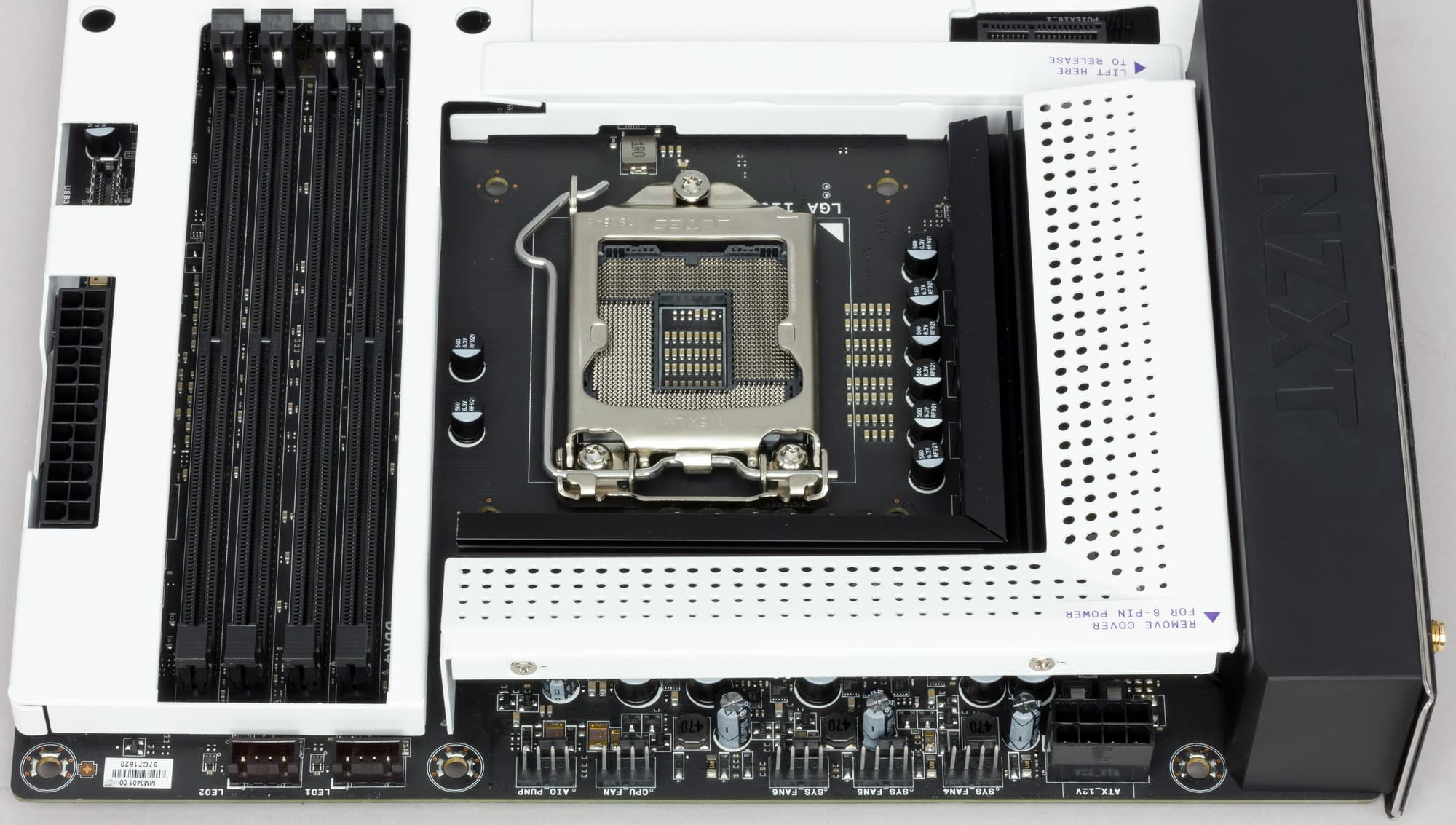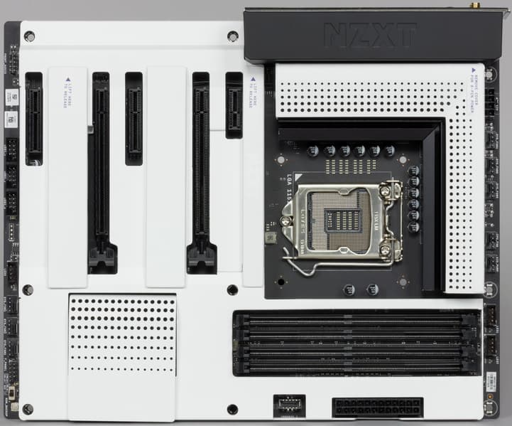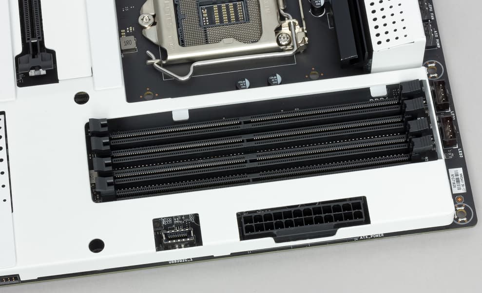 Для установки модулей памяти на плате NZXT имеется четыре DIMM-слота (для работы памяти в Dual Channel в случае использования всего 2 модулей их следует устанавливать в А2 и B2. Плата поддерживает небуферизованную память DDR4 (non-EСС), а максимальный объем памяти составляет 128 ГБ (при использовании UDIMM последнего поколения по 32 ГБ). Разумеется, поддерживаются профили XMP.