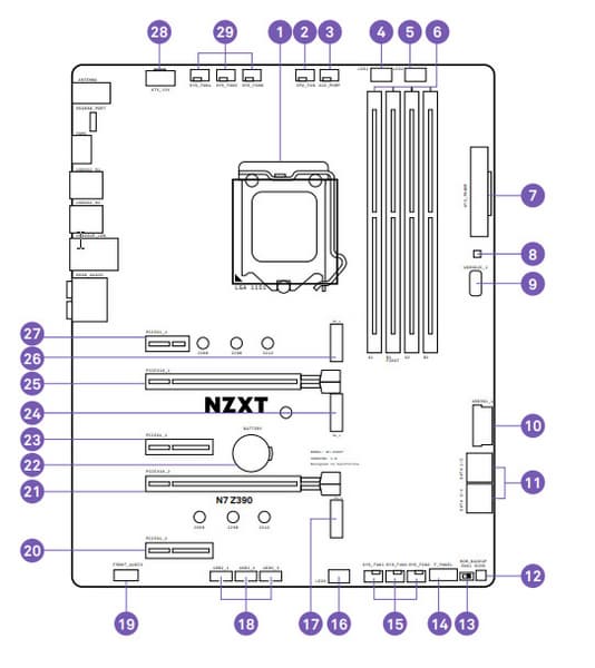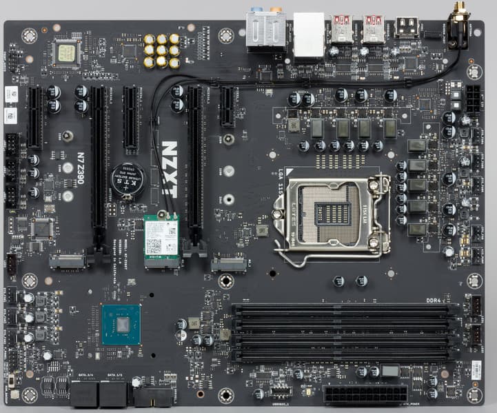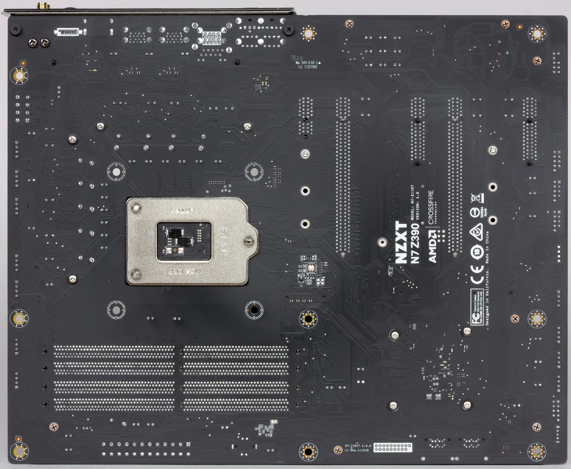 Форм-фактор ATX имеет размеры до 305×244 мм, а E-ATX — до 305×330 мм. Материнская плата NZXT N7 Z390 имеет размеры 305×244 мм, поэтому выполнена в форм-факторе ATX, и на ней имеются 9 монтажных отверстий для установки в корпус.