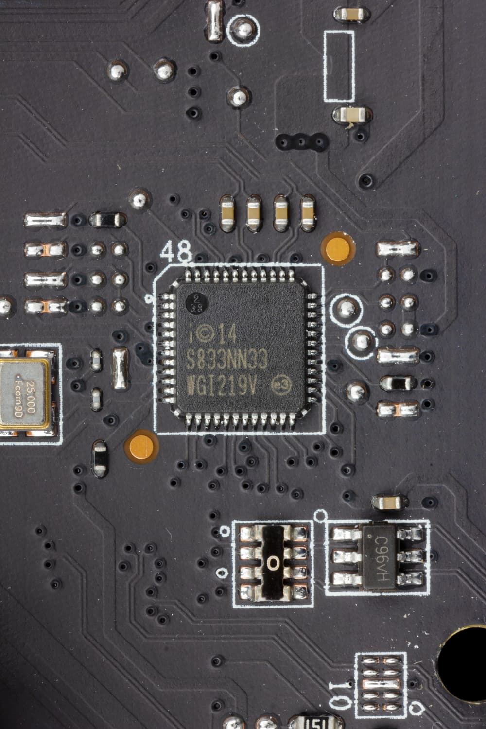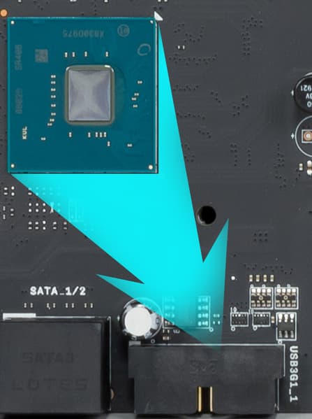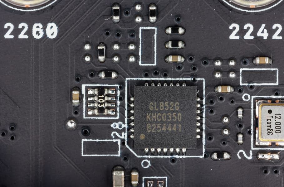 - 6 портов USB 2.0/1.1: все реализованы через контроллер Genesys Logic GL852G (на него потрачена 1 линия PCI-E) и представлены тремя внутренними разъемами (каждый на 2 порта).