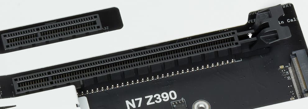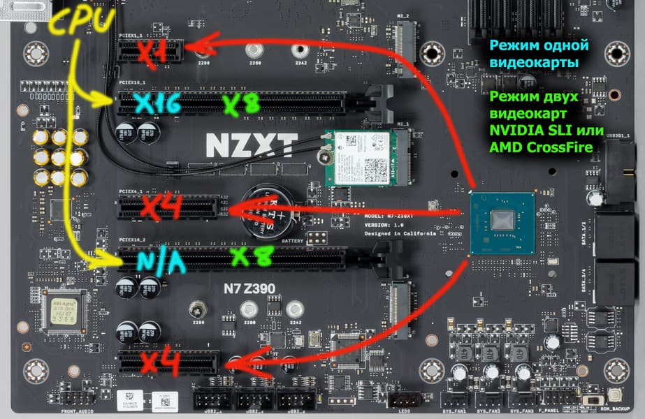 Всего на плате есть 5 слотов PCI-E: два PCI-Ex16 (для видеокарт или других устройств), один «короткий» PCI-Ex1 и два промежуточных PCI-Ex4. Если про первые два PCI-Ex16 я выше уже рассказал (они подключены к CPU), то остальные подключены к Z390.