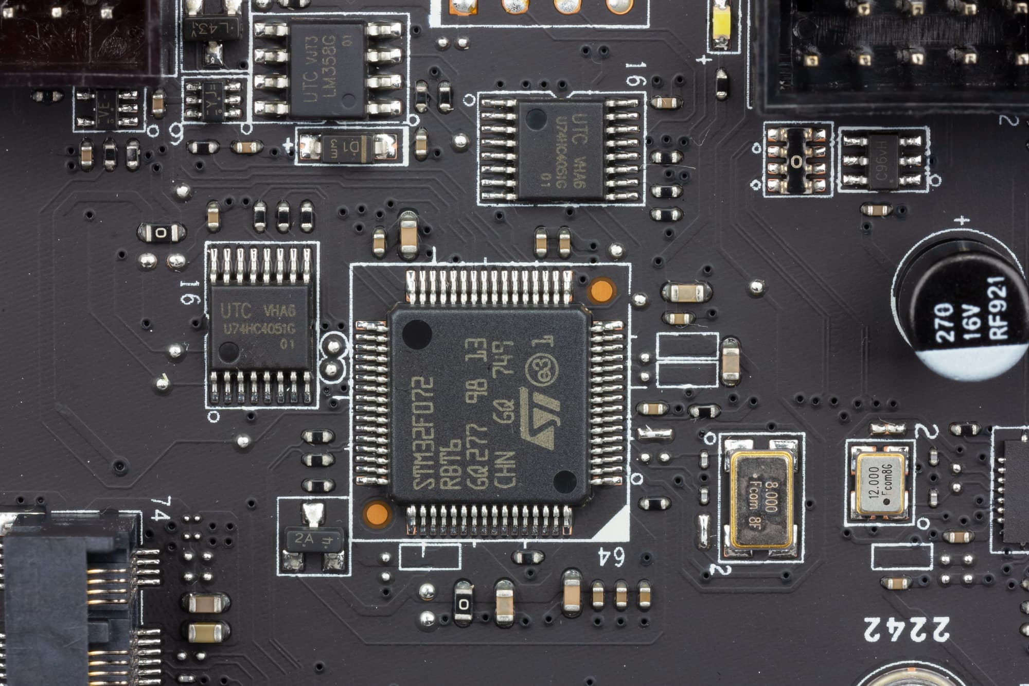 Контроль по синхронизации работы подсветки и вентиляторов возложен на чип STM32F от ST Microelectronics (целый ARM-процессор!).
