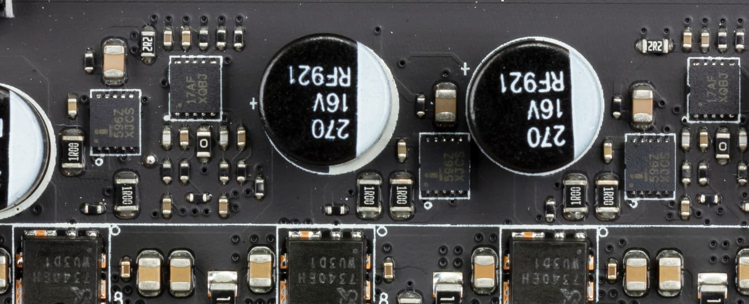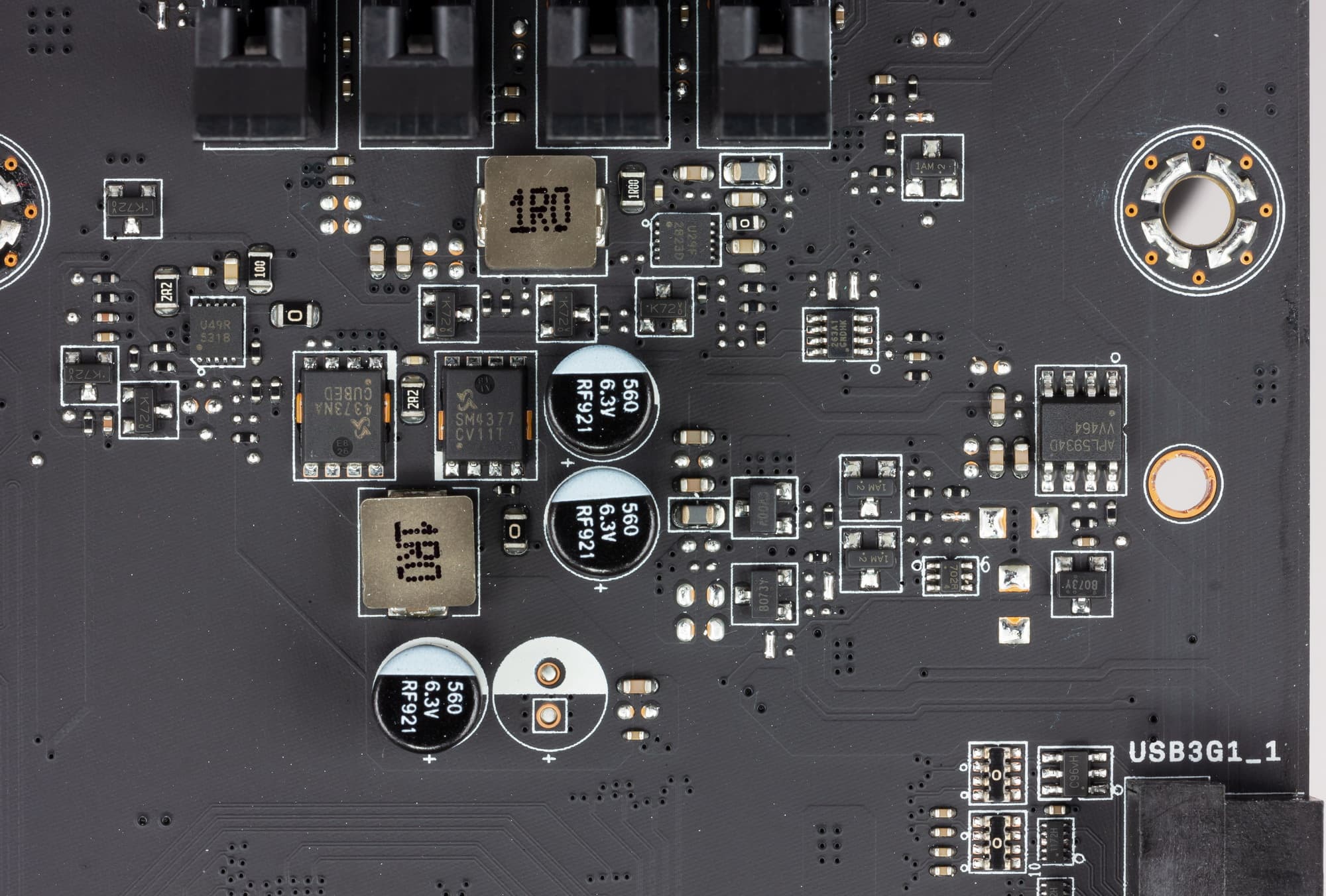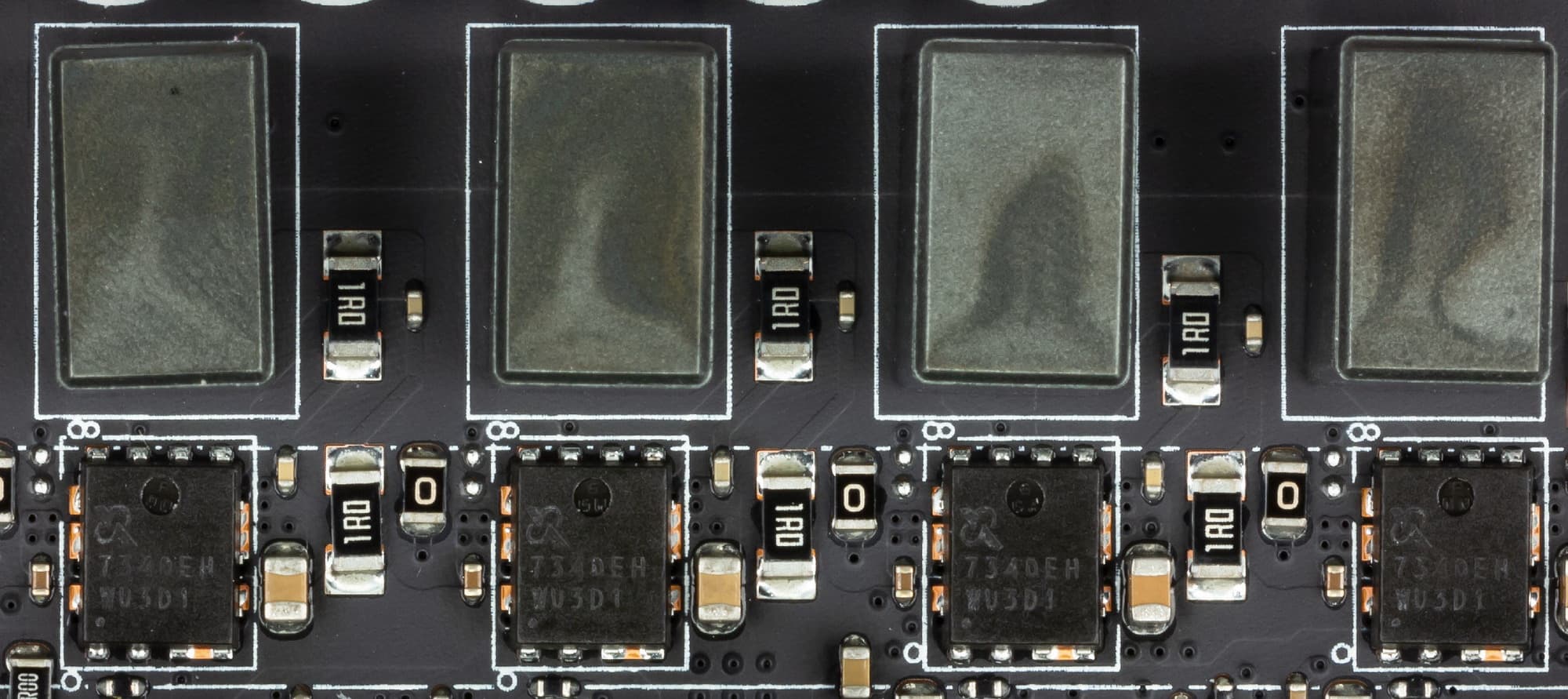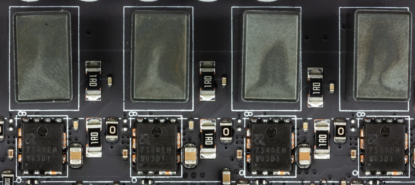 Каждый канал фазы имеет суперферритовую катушку и MOSFET SM7340EHKP от Sinopower.
