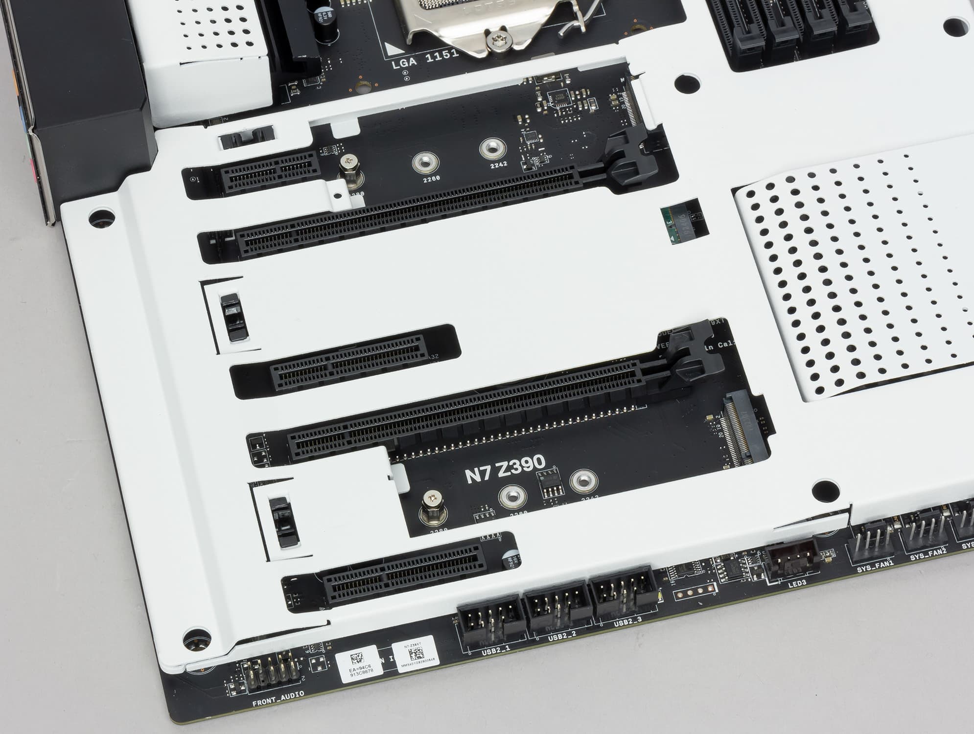 Так что, давайте-ка изучим NZXT N7 Z390 детально. Любопытно, что компания обошлась без громких и привычных уже уху названий типа Godlike, Maximus, Extreme и т. д. Просто N7 и все. Почему «семь»? Или почему «номер семь»? Просто в состав поставки входят семь элементов, покрывающих поверхность плат этой серии. Да, если снять всю эту «броню», частей будет именно 7. Впрочем, давайте по порядку.