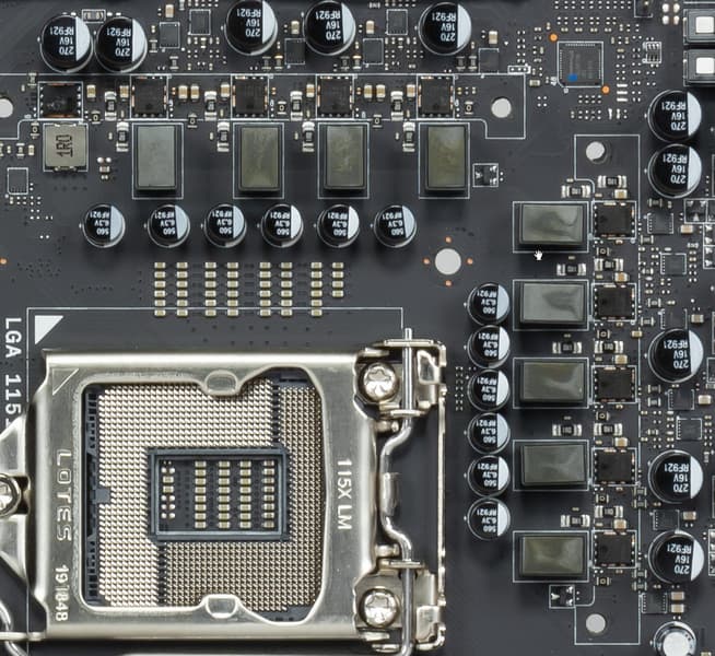 Поэтому сразу ищем и обнаруживаем удвоители фаз. 6 фаз питания VCore на самом деле превращаются в 3. Плюс 2 фазы питания графического ядра и 1 фаза на блок IO.