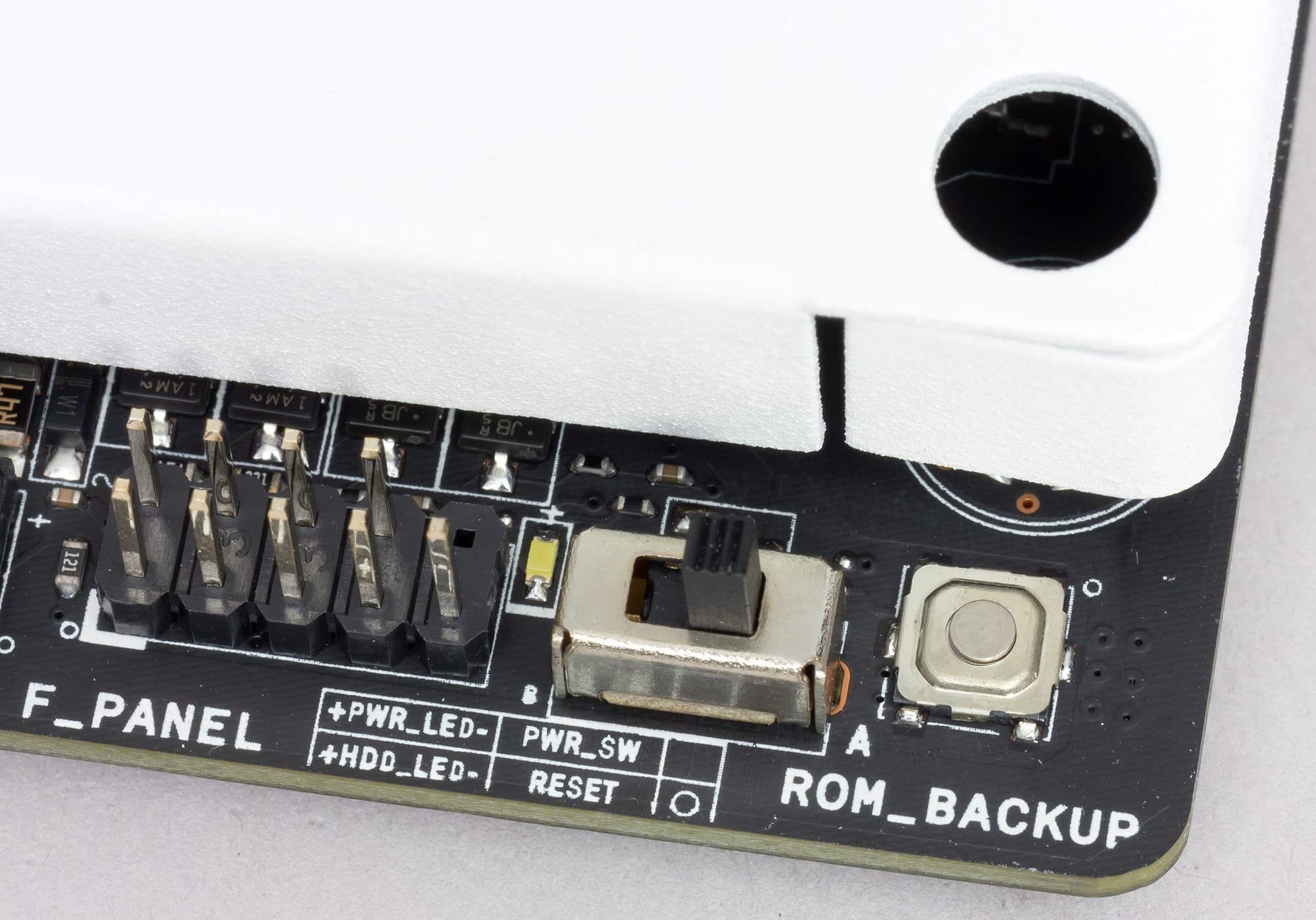 Рядом с ним кнопка восстановления поврежденной копии BIOS. Она позволяет скопировать запасную копию на место основной: надо лишь при выключенном ПК переключиться на резервную версию BIOS, затем включить, убедиться, что горит индикатор использования резервной версии BIOS (он слева от переключателя), войти в настройки BIOS и выключить там EUP Function, препятствующую записи в микросхемы BIOS. Затем выключить ПК и нажать на кнопку ROM_BACKUP на 5 секунд. ПК включится, а мигание светодиода будет обозначать процесс копирования резервной версии (B) в первичную (А). После того, как светодиод перестанет мигать — можно выключить ПК, отключить питание, переключить BIOS в исходное положение (А).