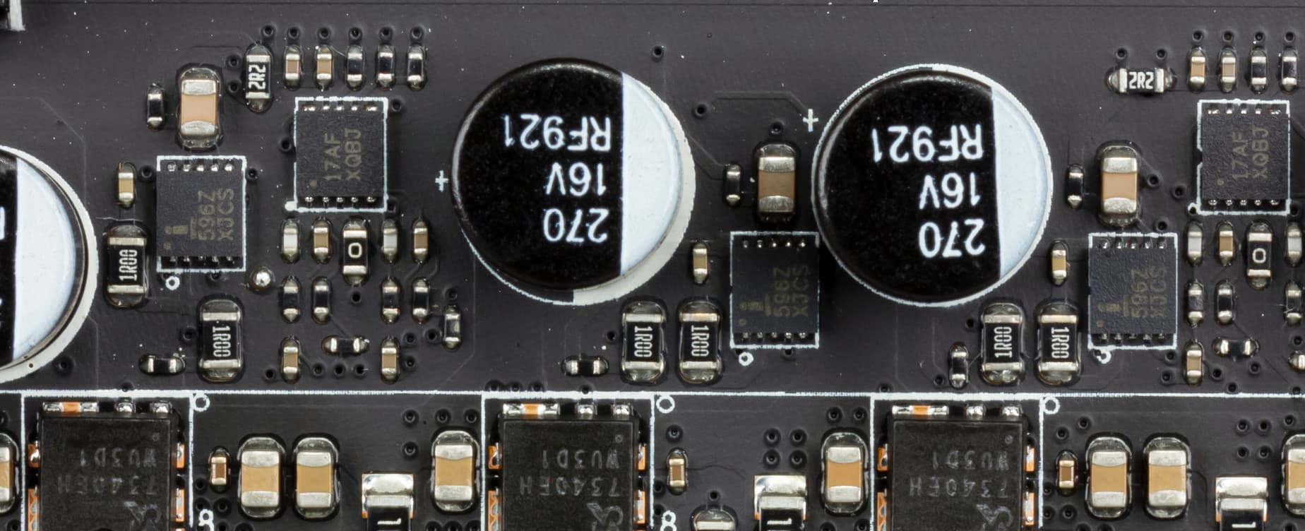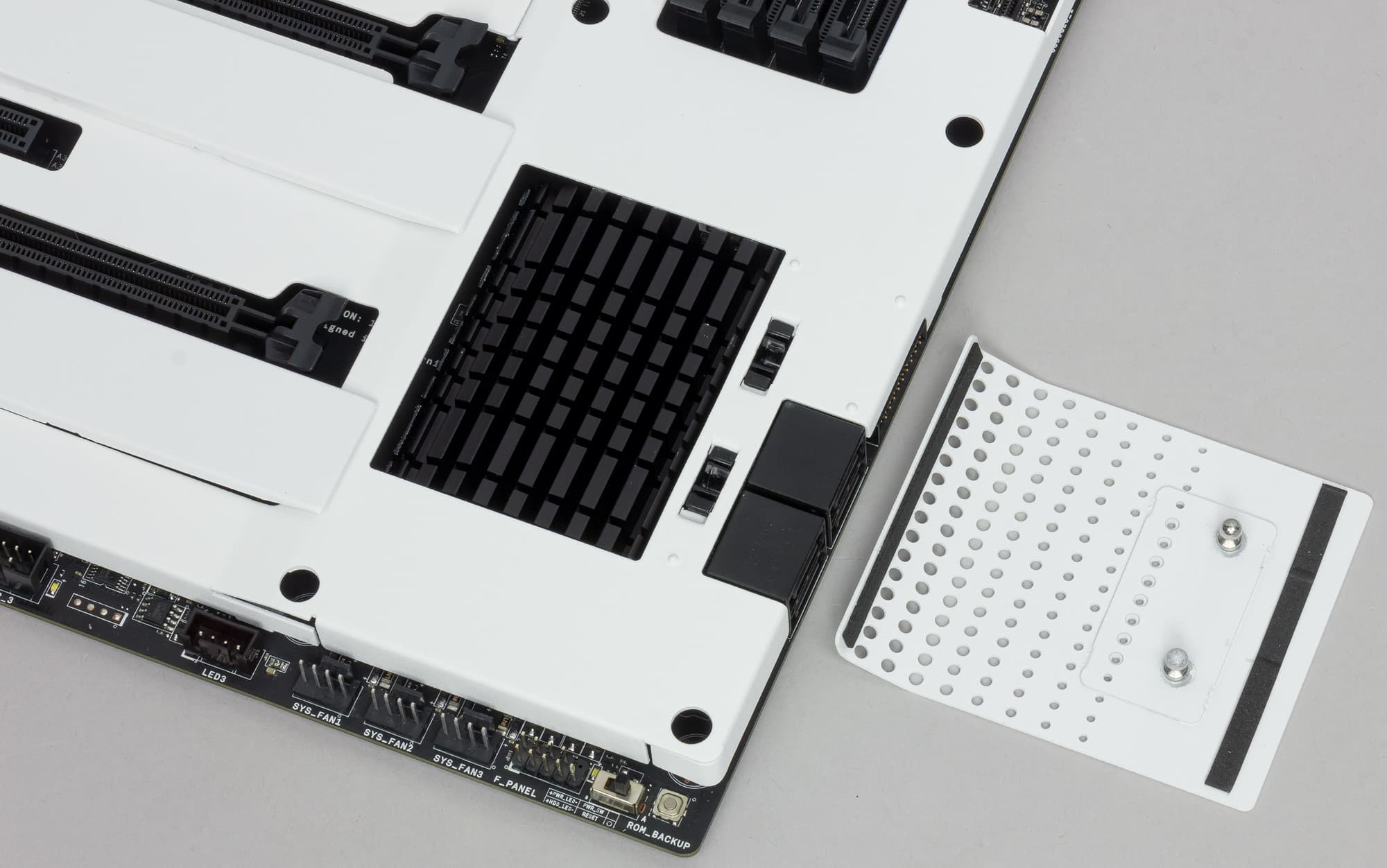 Оба радиатора M.2 имеют термоинтерфейс, однако должного прижима нет из-за того, что радиаторы должны «отстегиваться» в рамках общего концепта дизайна платы. Поэтому есть ощущение, что охлаждение модулей M.2 скорее бутафорное.