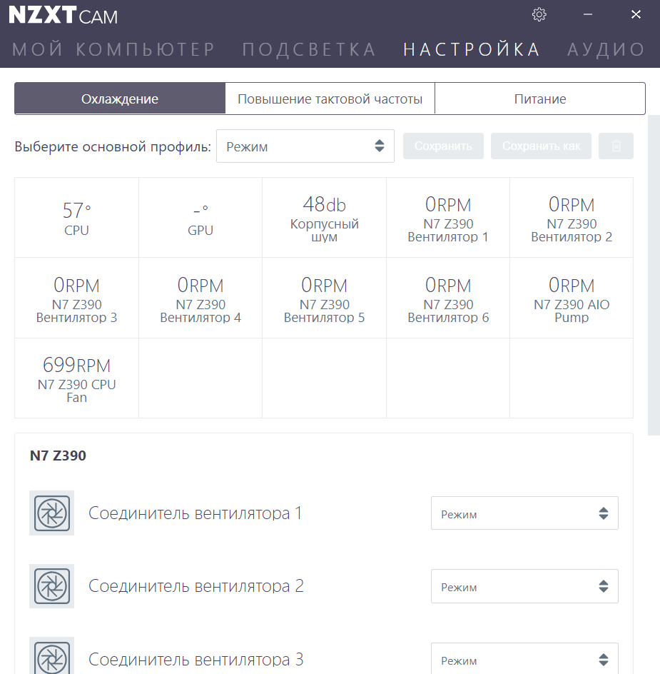 Последняя закладка — самая интересная с точки зрения возможностей ручного управления. Стоит особо отметить ущербную локализацию в данной программе. Например «режим» — означает режим производительности (Performance), а не просто некий режим. Конечно же, если сравнить с аналогичными программами иных производителей, то данная NZXT CAM выглядит чрезмерно скромно.
