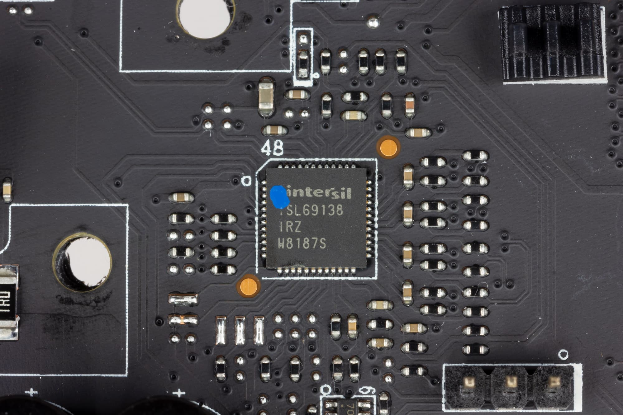 Но кто управляет фазами ядра? — Смотрим и видим цифровой контроллер Intersil ISL69138 (от Renesas Electronics). Но он умеет работать максимум с 7 фазами.