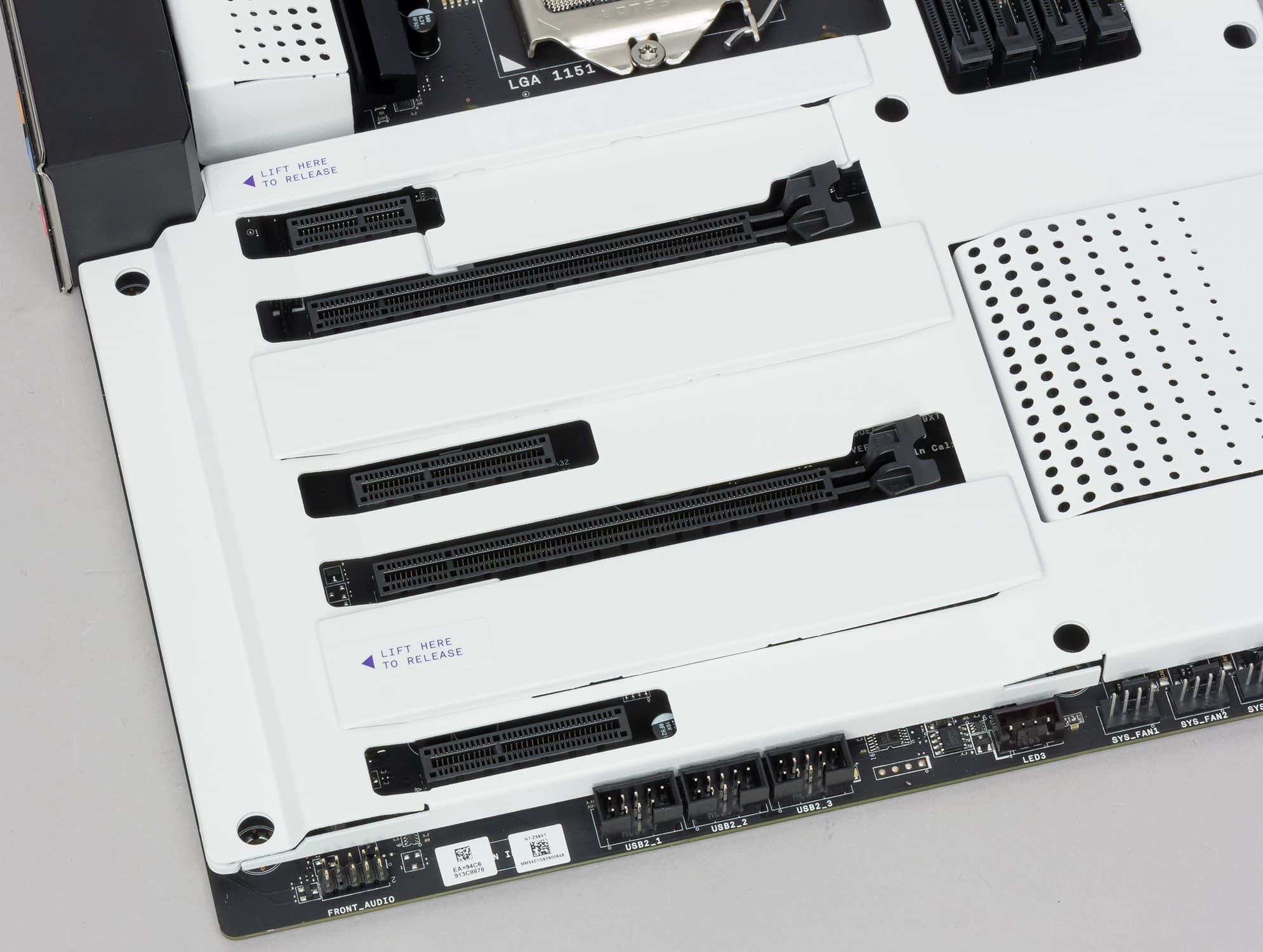 Кому-то может показаться плюсом оригинальный дизайн платы с покрытием ее этаким белым «панцирем», а кто-то посчитает это лишним (к тому же охлаждение модулей в слотах M.2 — бутафорское). В то же время, подсветки у самой платы нет, а внешняя подключаемая подсветка должна быть из числа продуктов NZXT.