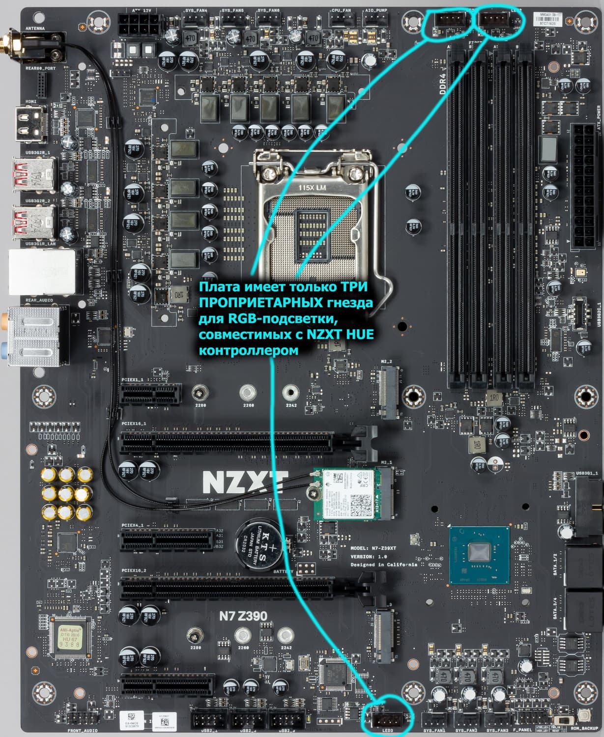 И все же надо напомнить, что на материнке есть три разъема для подключения собственной от NZXT подсветки (управляемой через свой контроллер NZXT Hue). Однако это все же скорее надо отнести к минусам, чем к плюсам: универсальных RGB/ARGB систем подсветок на рынке на 10 порядков больше, чем аналогичных решений от NZXT.