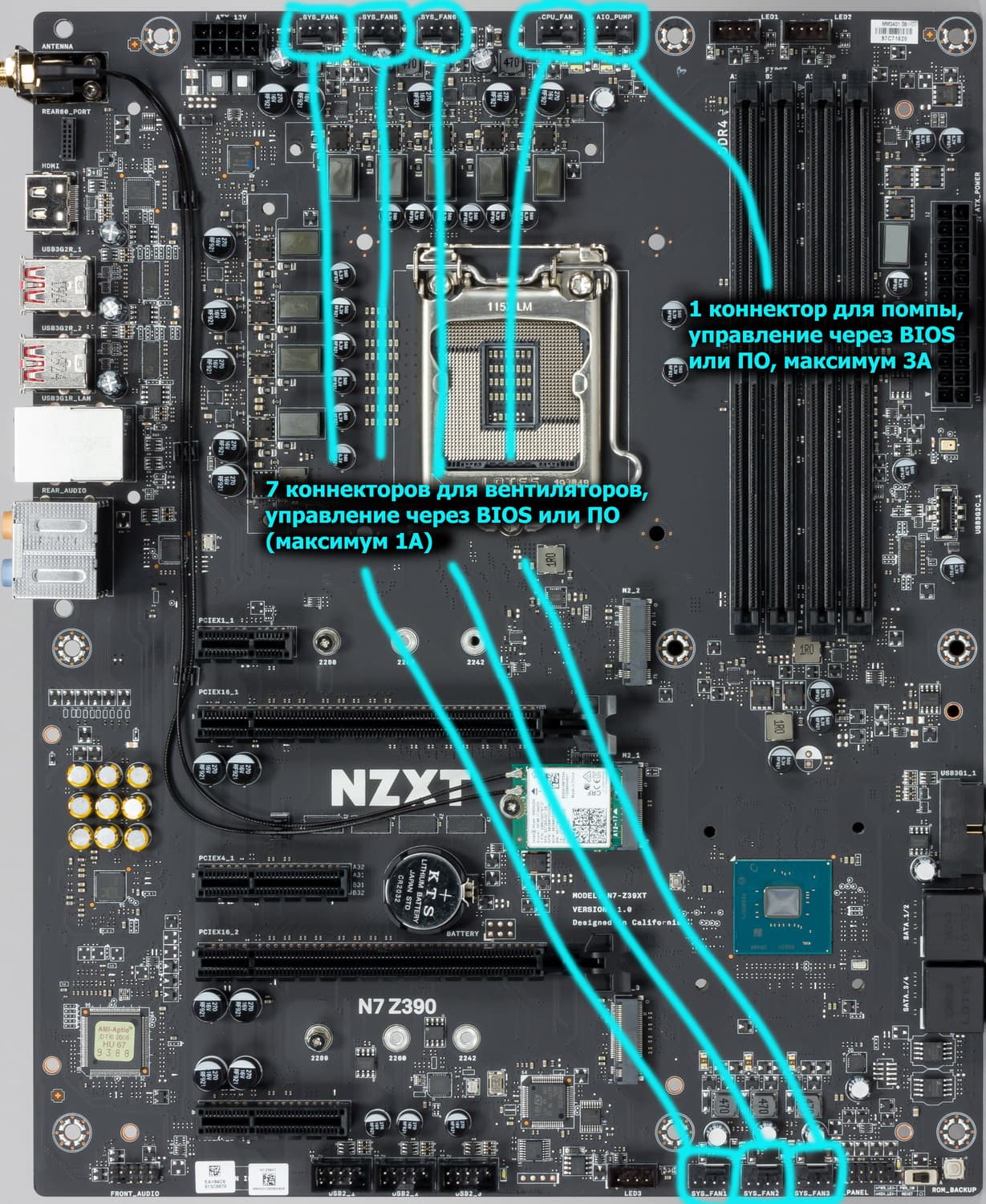 Функциональность у NZXT N7 Z390 на хорошем уровне: имеется 15 портов USB разных видов (включая 5 самых быстрых на сегодня), 2 слота PCIe х16 (хотя они не могут похвастать полной скоростью одновременно, поскольку у совместимых процессоров всего 16 линий PCIe на всех) с возможностью создать Nvidia SLI или AMD CrossFire, 3 «коротких» слота PCIe x1/x4 для иных карт расширения, 2 слота M.2 и 4 порта SATA. Система питания процессора явно среднего уровня, как и охлаждение зоны VRM и чипсета. Плата имеет 8 разъемов для подключения вентиляторов и помп, да и по набору сетевых контроллеров смотрится достойно: есть проводной гигабитный Ethernet и беспроводной контроллер, реализующий Wi-Fi 802.11ac и Bluetooth 5.0.