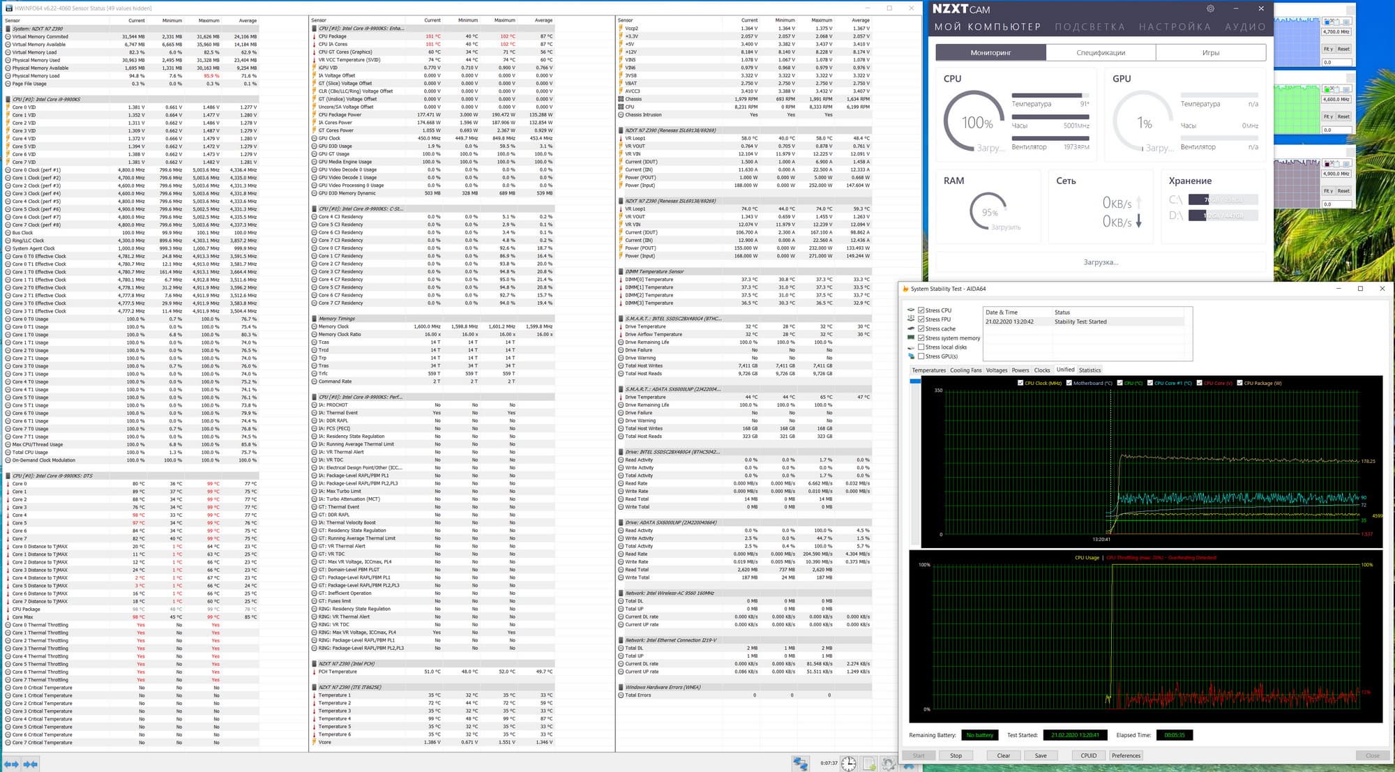 И что мы видим? Что во-первых, Intel Turboboost попытался выставить 5,0 ГГц, однако процессор стал перегреваться, потому частоты были снижены. Тем не менее, даже при 4,6-4,7 ГГц процессор 9900KS(!) временами уходил в троттлинг, нагреваясь выше 99 °C. Система охлаждения работала отменно, почти на максимуме оборотов, поэтому вопрос явно не в ней. Параметры нагрева чипсета и иных частей матплаты — были отличными: не выше 50-52 °C.