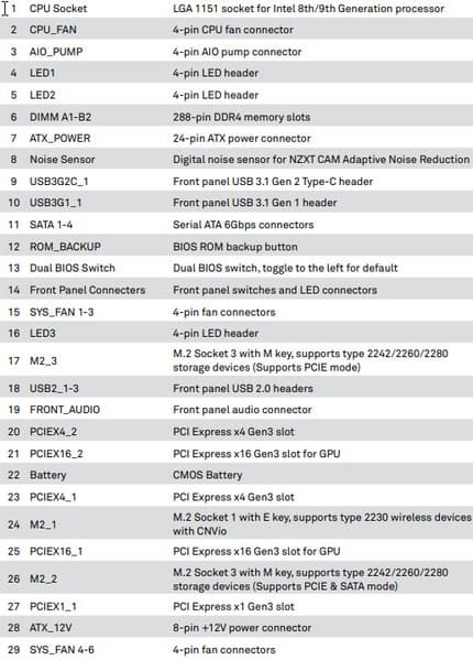 | Прочие внутренние элементы | 24-контактный разъем питания ATX 1 8-контактный разъем питания EPS12V 1 слот M.2 (E-key), занят адаптером беспроводных сетей 1 разъем для подключения порта USB 3.2 Gen2 Type-C 1 разъем для подключения 2 портов USB 3.2 Gen1 3 разъема для подключения 6 портов USB 2.0 8 разъемов для подключения 4-контактных вентиляторов и помп ЖСО 3 разъема для подключения RGB-подсветок от NZXT 1 разъем аудио для передней панели корпуса 2 разъема для подключения управления с передней панели корпуса 1 переключатель BIOS 1 кнопка восстановления BIOS 1 датчик шума |