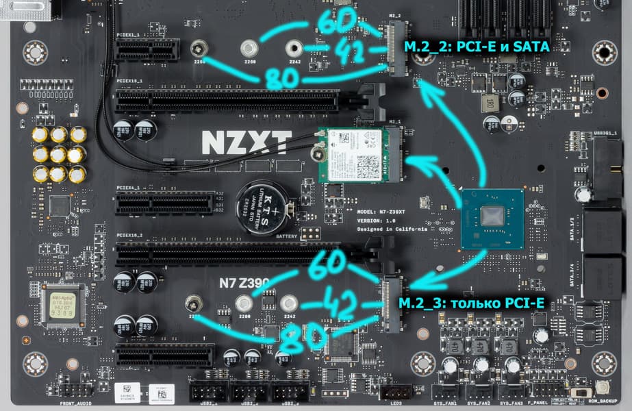 Один из слотов M.2_2 поддерживает модули с любым интерфейсом, а другой M.2_1 — только с PCI-E интерфейсом, при этом оба поддерживают модули размером до 2280 включительно.