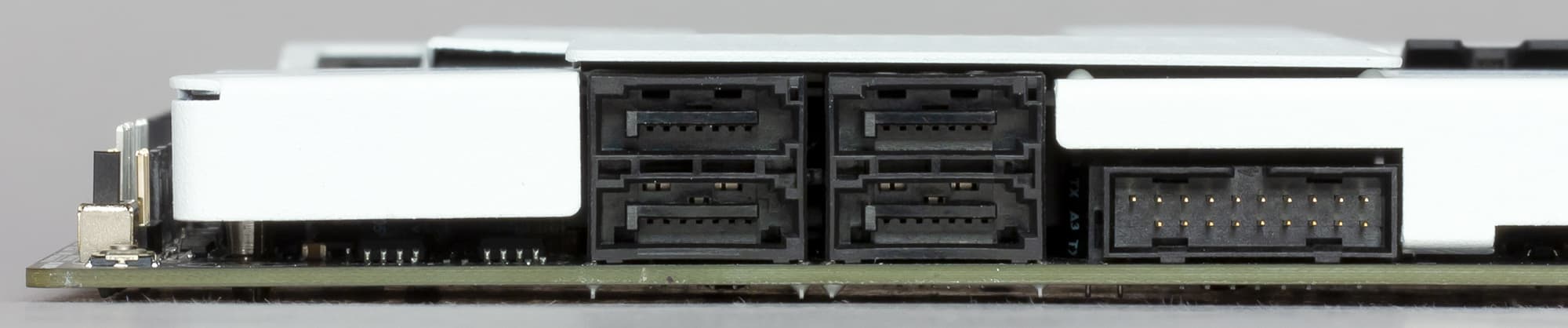 Всего у платы 4 разъема Serial ATA 6 Гбит/с + 2 слота для накопителей в форм-факторе M.2. (Еще один слот M.2, спрятанный под кожухом блока разъемов задней панели, занят контроллером беспроводных сетей Wi-Fi/Bluetooth.). Все порты SATA реализованы через чипсет Z390 и поддерживают создание RAID.