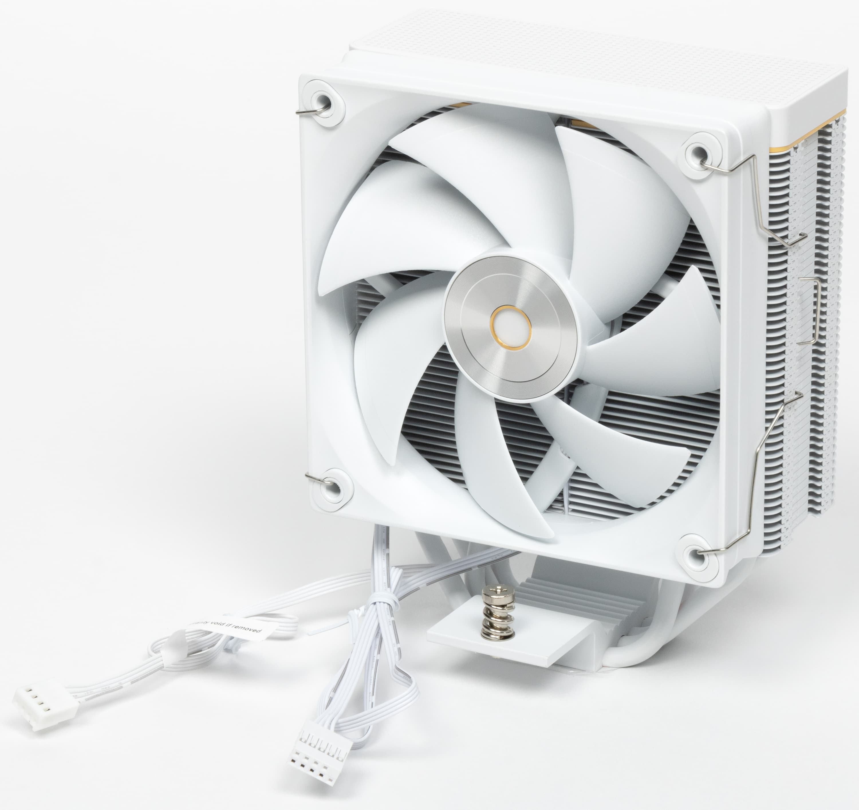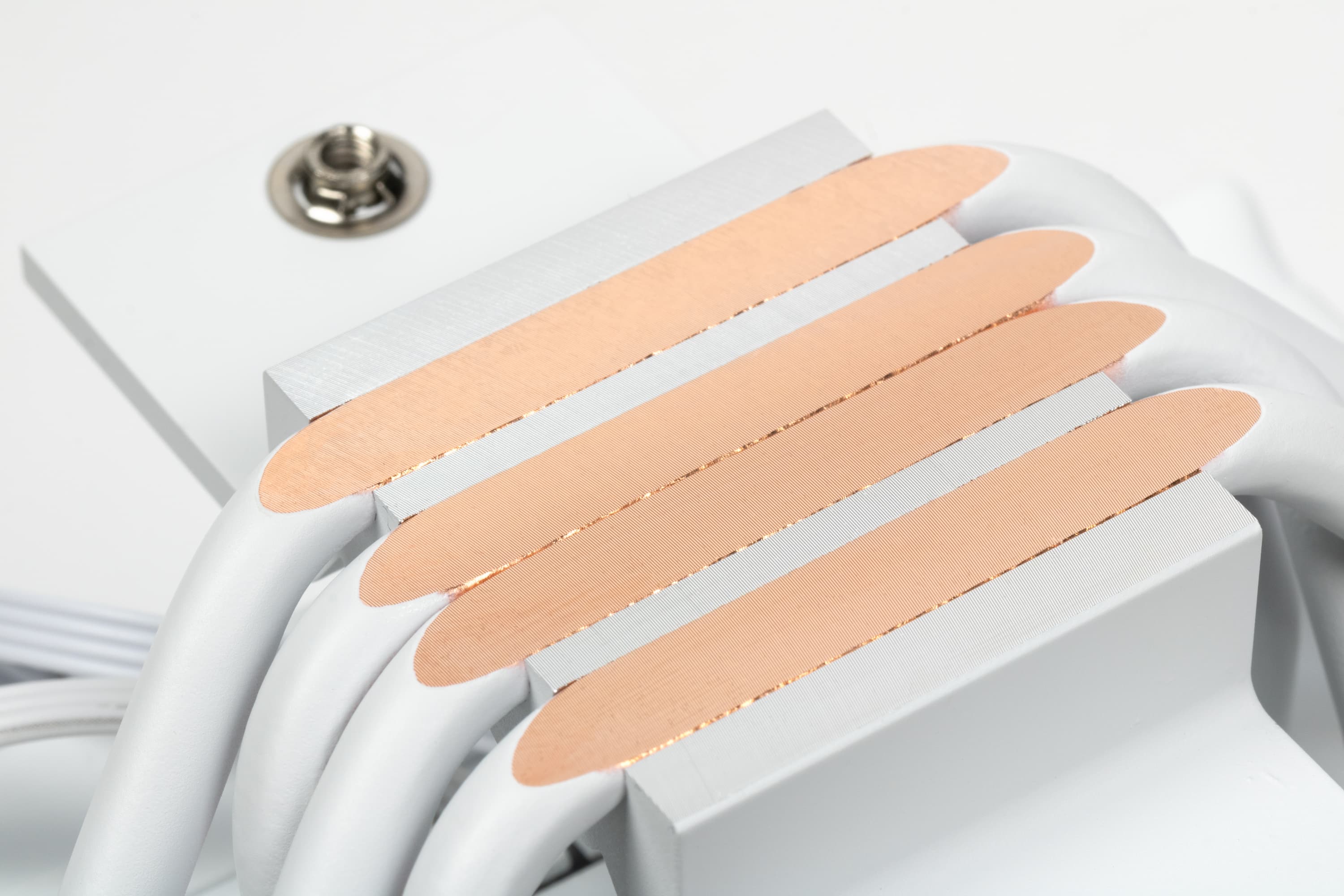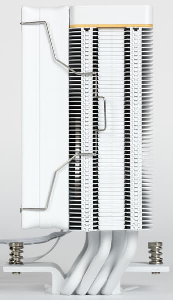 Кулер оснащен вынесенным радиатором, к которому тепло от теплосъемника передается по четырем тепловым трубкам диаметром 6 мм. Трубки медные, нижняя часть теплосъемника алюминиевая, но здесь это не имеет существенного значения — из-за прямого контакта трубок с крышкой процессора. Трубки, нерабочая поверхность теплосъемника и пластины радиатора имеют белое (в нашем случае) или черное полуматовое лакокрасочное покрытие. А вот окрашивать какие-либо детали крепежа в разные цвета в компании не стали.