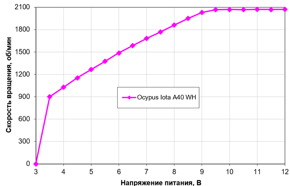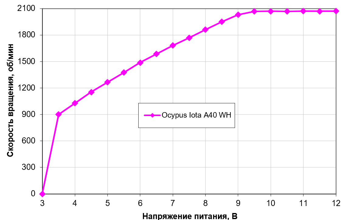 Поиграть с напряжением можно и в других целях, поскольку скорость вращения вентилятора стабилизирована на максимальной только от 9 В, а ниже имеем лишь немного меньший диапазон, чем при работе с ШИМ. Отключается вентилятор на 3,1 В, включаются обратно — на 3,3 В. Вентиляторы допустимо подключать к источнику с напряжением 5 В.