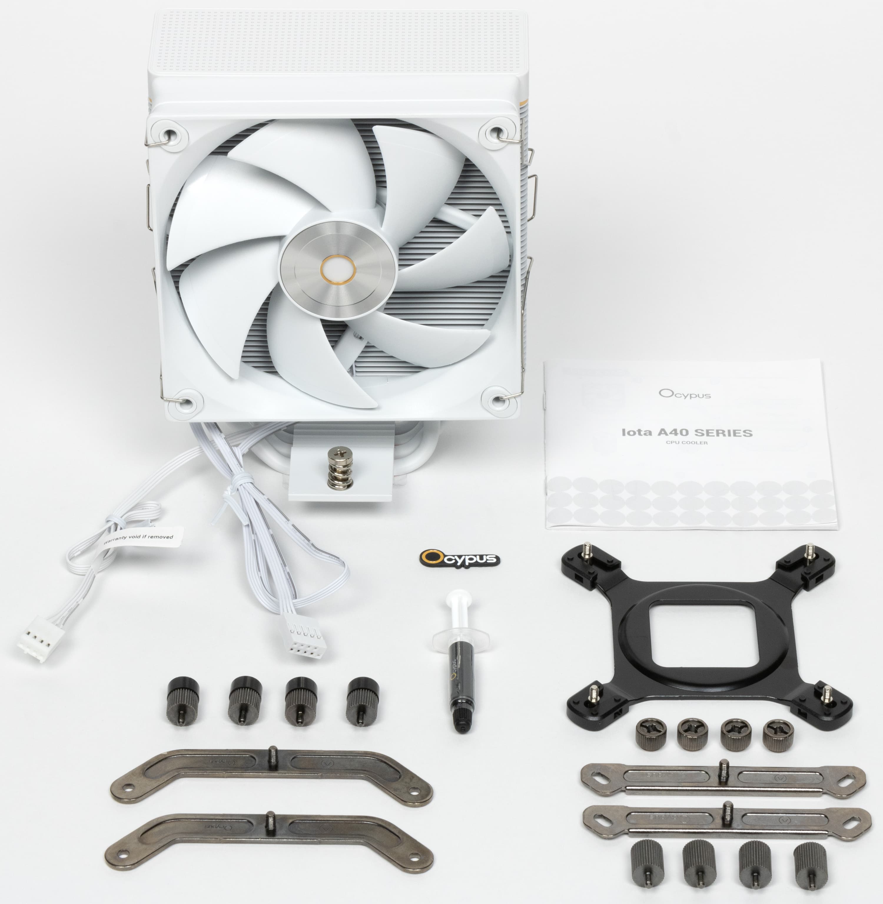 Поставляется процессорный охладитель Ocypus Iota A40 в коробке из относительно тонкого картона неброских цветов. Чего в данном случае достаточно, поскольку внутри все компоненты надежно фиксируются парой «крышек» из вспененного полиэтилена. Сам главный герой изображен прямо на коробке, так что не перепутаешь. В нашем случае, как несложно догадаться, речь идет о модели всё еще довольно редкого, но набирающего популярность белого цвета. Доступен и черный — с индексом «BK» вместо «WH». В данном случае это важный момент, поскольку такой кулер нет смысла приобретать для использования в «глухом» корпусе — иначе на индикатор полюбоваться не получится, а на цене он сказывается заметно.