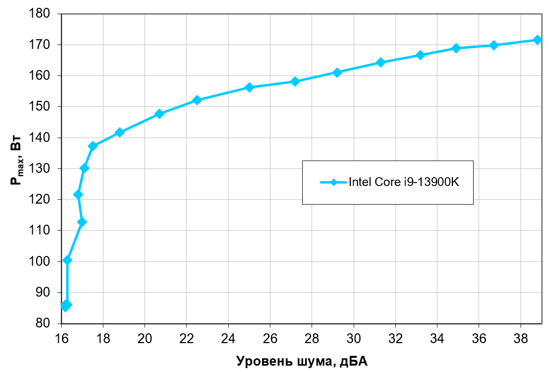 Попробуем уйти от условий тестового стенда к более реалистичным сценариям. Допустим, что температура воздуха, забираемого вентилятором системы охлаждения, может повышаться до 44 °C, но температуру процессора под максимальной нагрузкой не хочется повышать выше 80 °C. Ограничившись этими условиями, построим зависимость реальной максимальной мощности (обозначенной как Pmax), потребляемой процессором, от уровня шума (подробности описаны в методике):