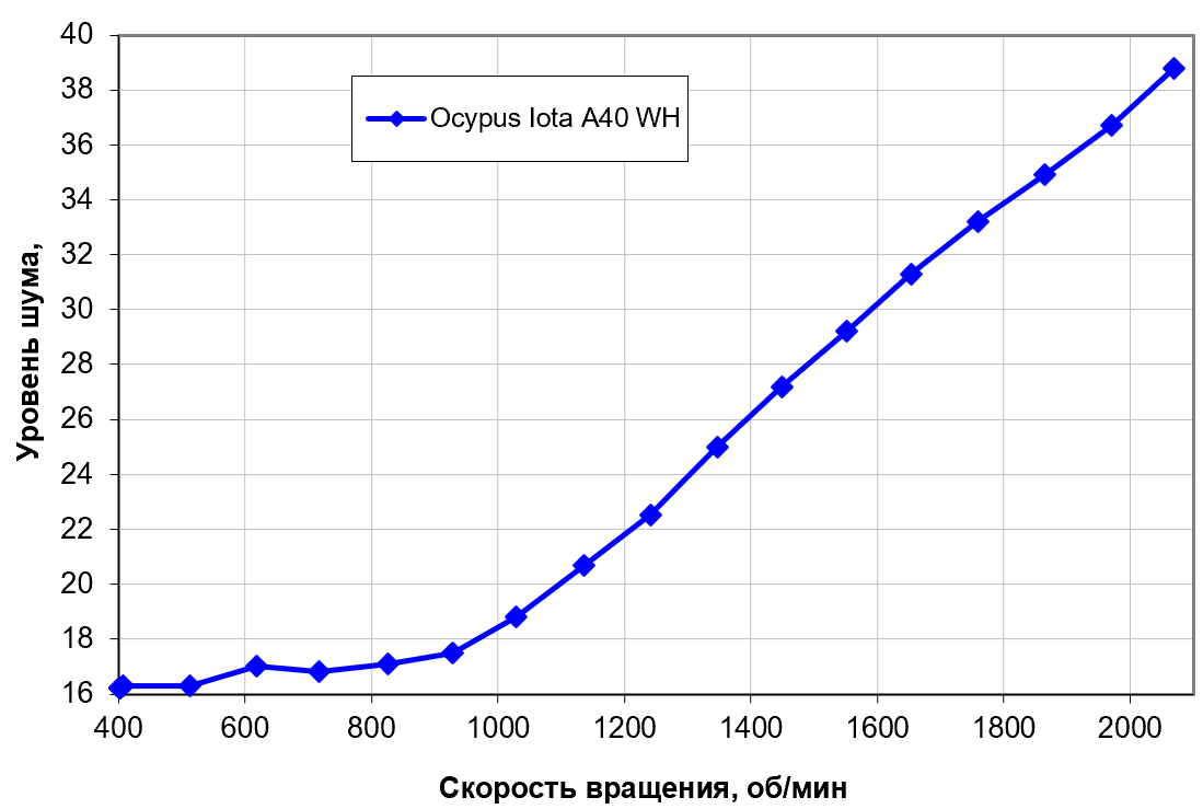 Зависит, конечно, от индивидуальных особенностей и других факторов, но в случае кулеров где-то от 40 дБА и выше шум с нашей точки зрения очень высокий для настольной системы, от 35 до 40 дБА уровень шума относится к разряду терпимых, ниже 35 дБА шум от системы охлаждения не будет сильно выделяться на фоне типичных небесшумных компонентов ПК — вентиляторов корпусных, на блоке питания, на видеокарте, а также жестких дисков, а где-то ниже 25 дБА кулер можно назвать условно бесшумным. Фоновый уровень был равен 16,1 дБА (условное значение, которое показывает шумомер). К нему мы стабильно пришли бы при отключении вентилятора (естественно), но несложно заметить, что работа на минимальных оборотах и так обеспечивает шум, практически неотличимый от фонового без приборов. А вот на максимуме вентилятор тихим не назовешь, поскольку он бодро рвется покорить 40 дБА. Ничего удивительного в этом нет — у всех так.