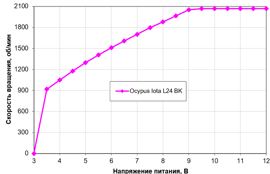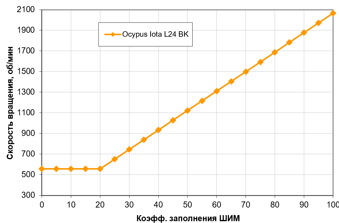 Несмотря на совпадающие название, вентиляторы для СЖО и «воздуха» различаются не только длиной кабеля питания. Последние снижают скорость чуть быстрее и при коэффициенте заполнения (КЗ) 20% стабилизируются примерно на 400 об/мин, а первые останавливают процесс на 550 об/мин. Но в целом результат и там, и там хороший — монотонный рост скорости вращения в широком диапазоне регулировки скорости вращения. В целом поведение Iota F12 этой модификации типично для вентиляторов большинства СЖО: ниже 500+ об/мин они тоже не опускаются, обеспечивая на этом уровне достаточный воздушный поток для минимальной вентиляции корпуса. Если же для решения этой задачи будут использоваться прочие корпусные вентиляторы, эти можно и остановить — для чего придется прибегнуть к снижению напряжения.