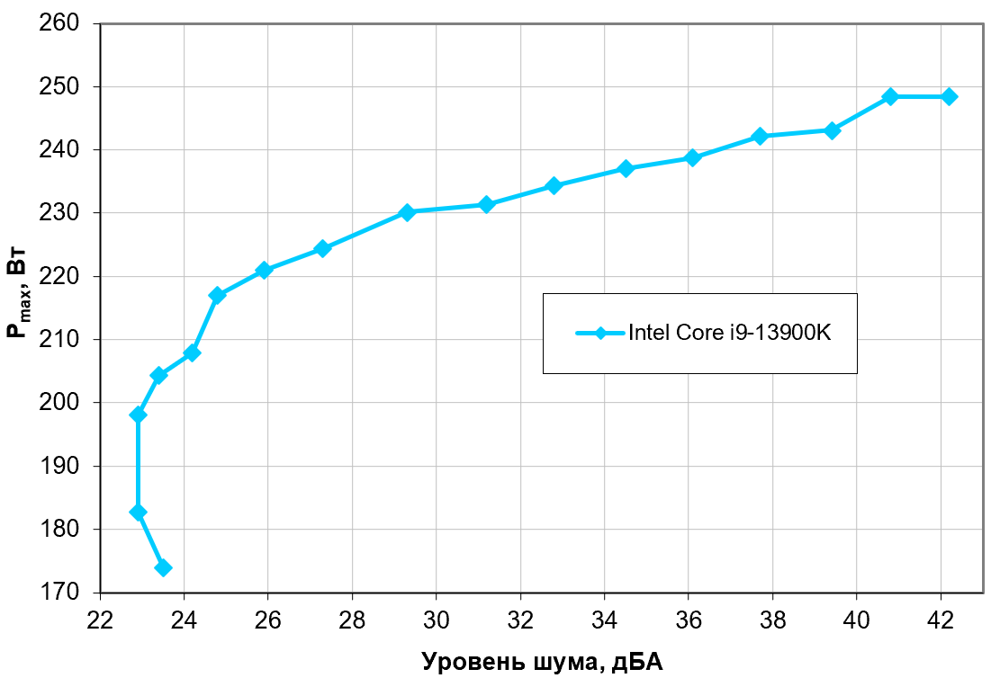 Приняв 25 дБА за критерий условной бесшумности, получим примерную максимальную мощность процессоров, соответствующих этому уровню. Безо всяких натяжек это 218 Вт для процессора Intel Core i9-13900K и ему подобных). Если не обращать внимания на уровень шума в разумных пределах, то потолок мощности можно увеличить примерно до 230 Вт, а в неразумных — и до 250. Еще раз уточним, это в жестких условиях обдува радиатора нагретым до 44 градусов воздухом. При снижении температуры воздуха и/или увеличении максимально допустимой температуры процессора (для него допустимо 100 °C) указанные пределы мощности для бесшумной работы и максимальной мощности радикально возрастают.