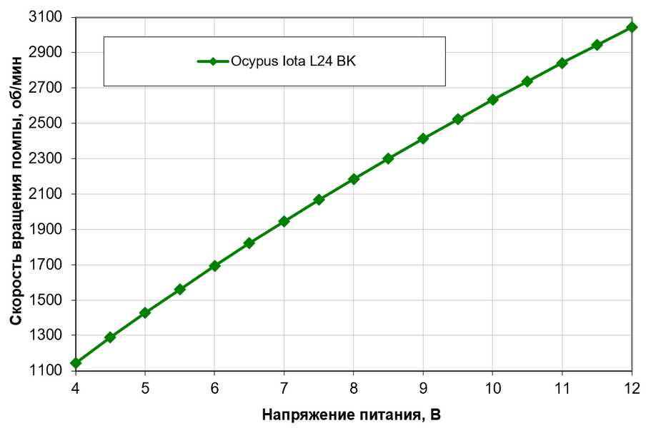 Скоростью вращения помпы можно управлять только при помощи напряжения, зато делать это получается в широком диапазоне — почти монотонный график до 4 В, ниже чего помпа отключается. Главное не переусердствовать, поскольку для нормальной работы помпы с гидродинамическим подшипником частота вращения должна быть точно не ниже 50% от штатной. Эта отметка проходится примерно на 5,5 В — поэтому лучше не подключать помпу к 5 В :)