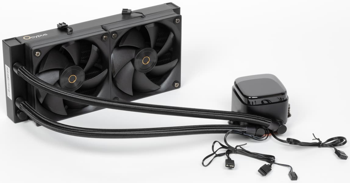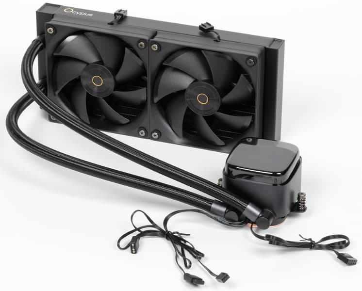 Фактически это те же вентиляторы Ocypus Iota F12, с которыми мы уже знакомы по башенному кулеру Iota A40 (и, скорее всего, они же используются и в двухбашенном Iota A62). Единственное отличие версии для СЖО — очень короткие кабели питания, так что в комплект входит удлинитель-раздвоитель длиной 65 + 10 см.