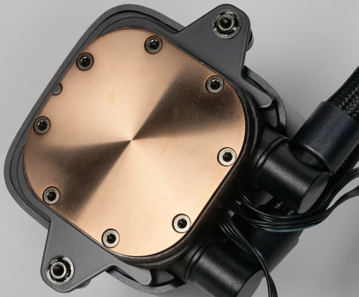 Система герметичная, заправлена, готова к использованию — даже вентиляторы уже установлены на посадочные места. Помпа интегрирована в один блок с теплосъемником. Подошвой теплосъемника, непосредственно прилегающей к крышке процессора, служит медная пластина. Ее внешняя поверхность ровная, шлифованная и слегка полированная. К центру она выпуклая с перепадом порядка 0,2-0,3 мм.