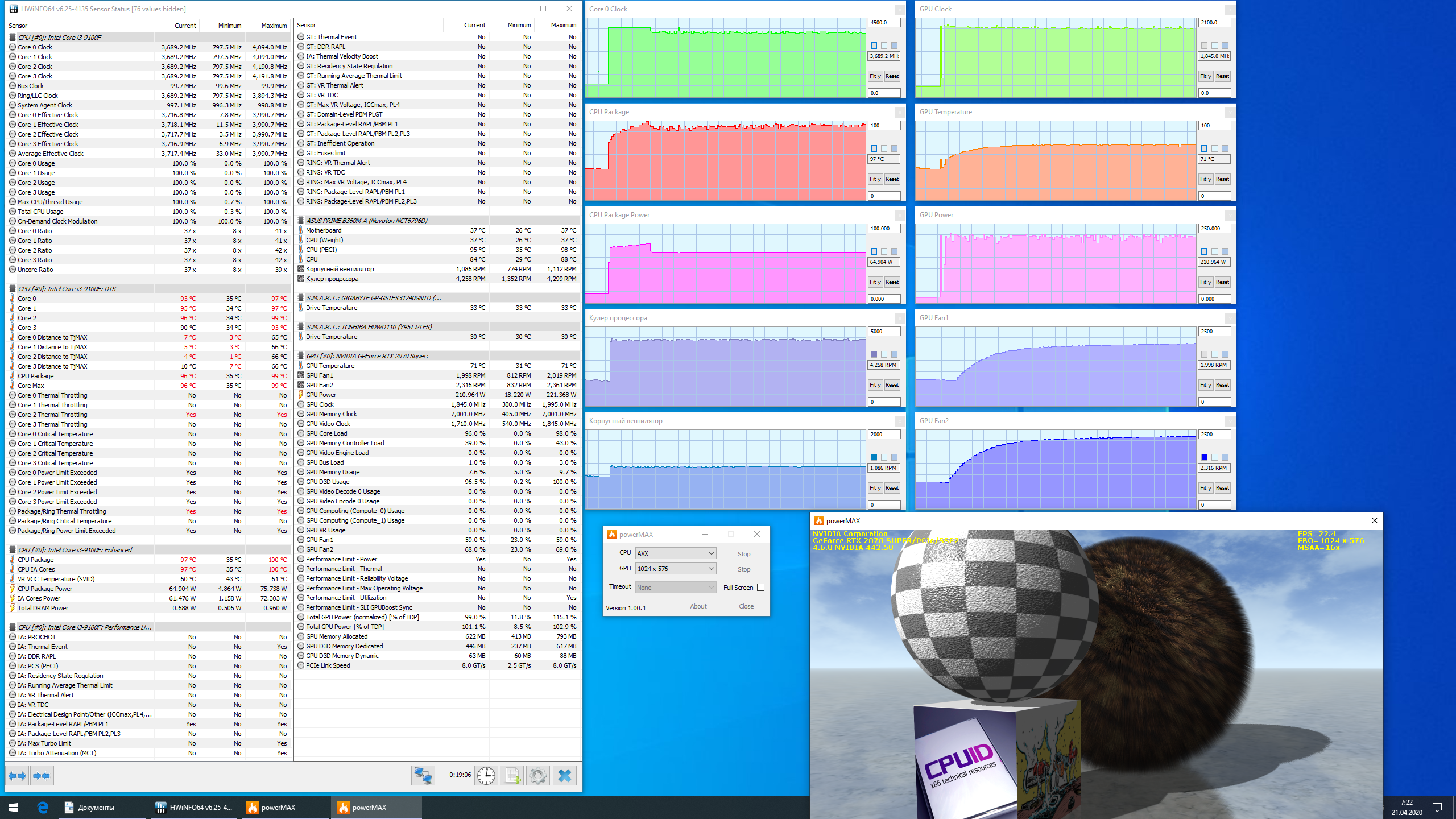 При одновременной стрессовой загрузке процессора и видеокарты выяснилось, что процессорный кулер «не тянет». Хотя он сразу же вышел на максимальный режим (4300 об/мин), а задний корпусный вентилятор прибавил еще немного и вращался на 1100 об/мин, приемлемо охлаждать процессор не получалось, тот быстро добрался до 100 °C в режиме Turbo Boost (при максимальном потреблении около 75 Вт), включился тротлинг. Однако и при снижении потребления до 65 Вт процессор лишь получил небольшую передышку: совсем скоро при повышении температуры воздуха в корпусе температура ядер снова начала подбираться к 100 °C, периодически одно ядро кратковременно тротлилось. Странно, что частота ядер при этом не опустилась с 4,0 до 3,6 ГГц, а упорно оставалась на 3,7 ГГц. Видеокарту все эти проблемы не затронули, она работала с теми же частотами, потреблением и нагревом, разве что максимальная частота вентиляторов оказалась чуть выше: 2050/2400 об/мин. Энергопотребление системы под стрессовой нагрузкой в пике доходило до 370 Вт, в установившемся режиме составляло 350 Вт. Шум оказался ограничен тем же уровнем 45 дБА, что и при максимальной нагрузке только на процессор, потому что самым громким элементом системы охлаждения компьютера является работающий в максимальном режиме кулер процессора.
