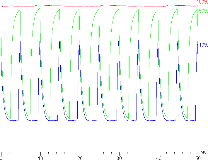 На уровне яркости ниже максимума есть значимая модуляция подсветки, но ее относительно высокая частота (200 Гц) и не очень большая амплитуда обуславливает отсутствие видимого глазом мерцания. В доказательство приведем графики зависимости яркости (вертикальная ось) от времени (горизонтальная ось) при различных значениях яркости: