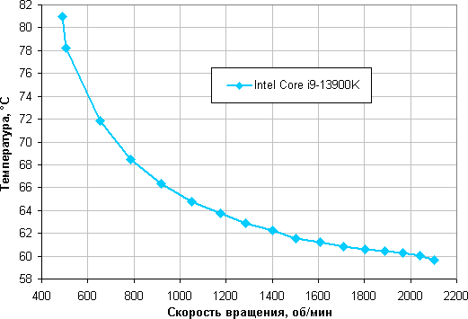 В этом тесте процессор Intel Core i9-13900K не перегревается (при 24 градусов окружающего воздуха) на оборотах вентиляторов, достигаемых при снижении КЗ до 20%, что соответствует примерно 490 об/мин. При этом максимальное потребление по данным мониторинга составило порядка 217 Вт, а по разъемам для питания процессора — 271 Вт. Напомним, что базовая мощность этого процессора составляет всего 125 Вт, а штатная максимальная кратковременная (турбо-лимит) — 253 Вт.