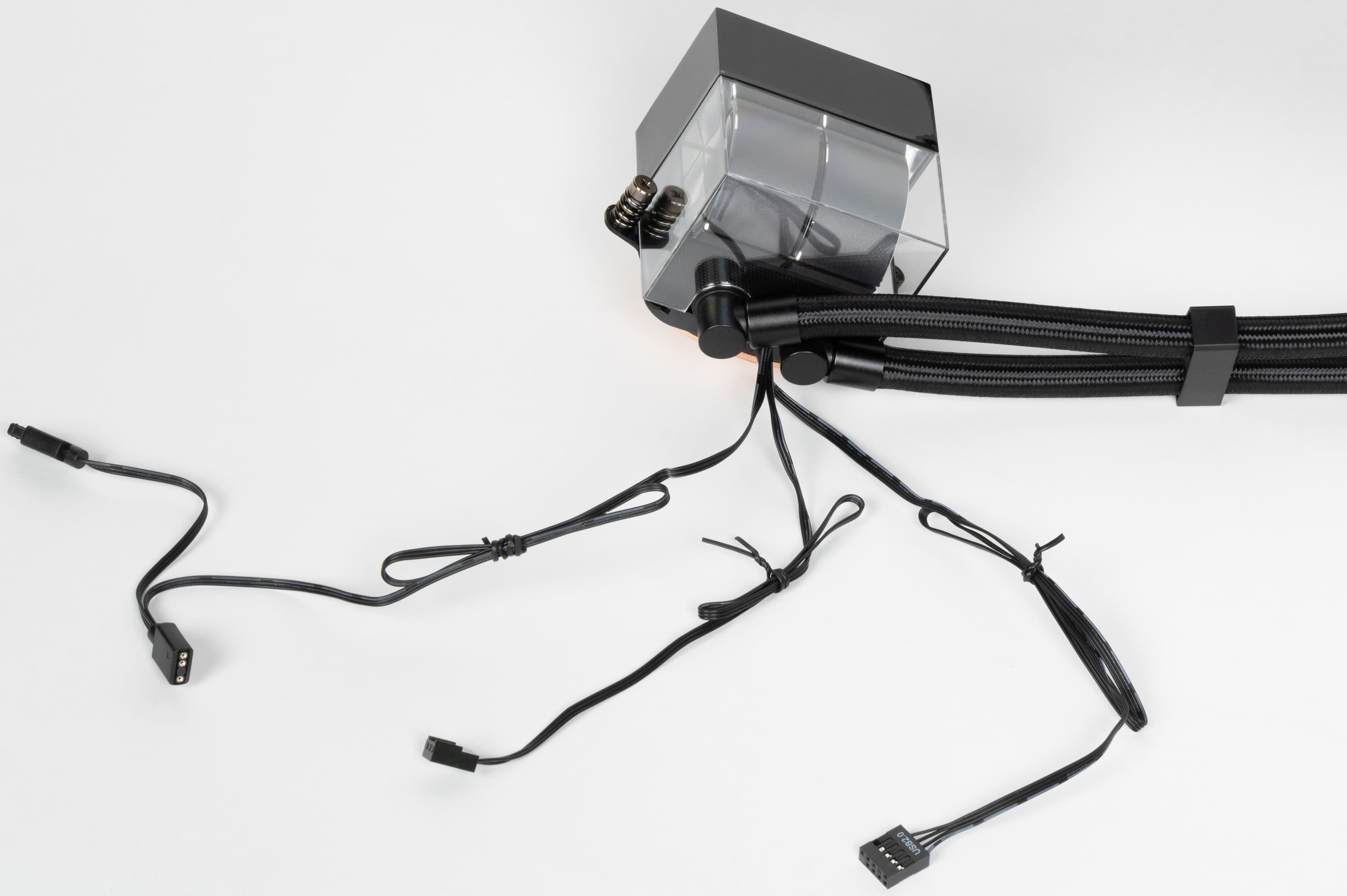 Длина кабеля питания от помпы — 2=35 см, кабеля подсветки — 46 см плюс 10 см до проходного разъема, кабеля USB с разъемом для подключения к колодке на системной плате — 47,5 см.