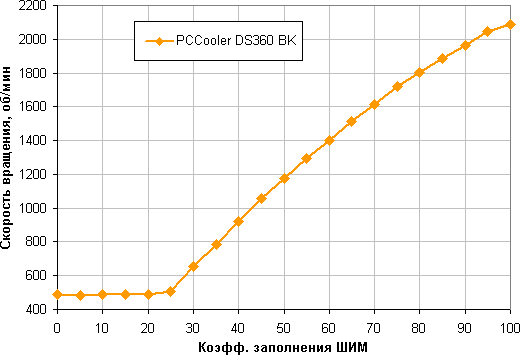 Хороший результат — монотонный рост скорости вращения при изменении коэффициента заполнения от 20% до 100%, диапазон регулировки скорости вращения широкий. При снижении коэффициента заполнения (КЗ) до 0% вентиляторы не останавливаются. Это может иметь значение, если пользователь хочет создать гибридную систему охлаждения, которая при низкой нагрузке работает полностью или частично в пассивном режиме.