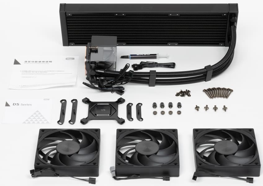 Поставляется система жидкостного охлаждения PCCooler DS360 BK в коробке из среднего по толщине гофрированного картона.