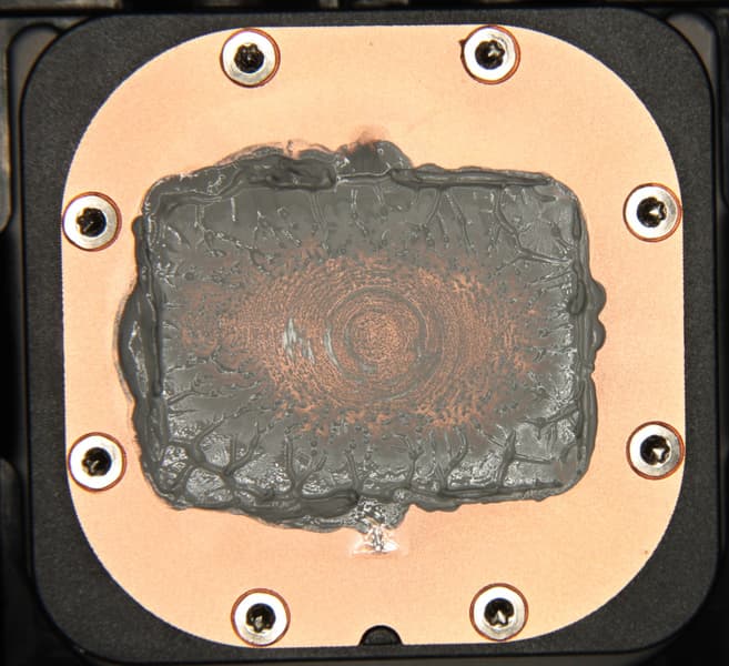 Видно, что термопаста распределилась тонким слоем на всю площади крышки процессора, а ее избытки выдавились за края. Участок плотного контакта расположен по центру и имеет большую площадь. (Распределение термопасты, конечно, изменилось при разъединении процессора и помпы.)