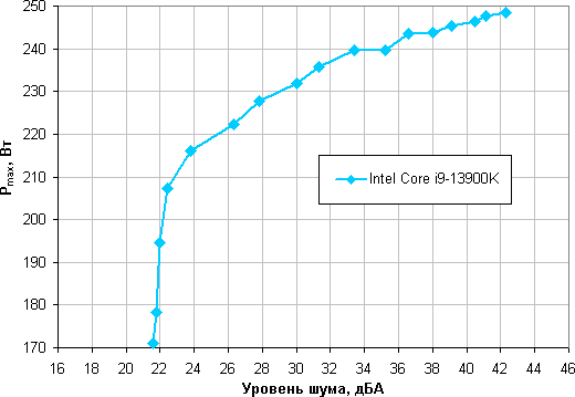 Приняв 25 дБА за критерий условной бесшумности, получим примерную максимальную мощность процессоров, соответствующих этому уровню. С небольшой натяжкой это 220 Вт для процессора Intel Core i9-13900K. Если не обращать внимания на уровень шума, то пределы мощности можно увеличить примерно до 248 Вт. Еще раз уточним, это в жестких условиях обдува радиатора нагретым до 44 градусов воздухом, при снижении температуры воздуха и/или увеличении максимально допустимой температуры процессора (для него допустимы 100 °C) указанные пределы мощности для бесшумной работы и максимальной мощности возрастают.