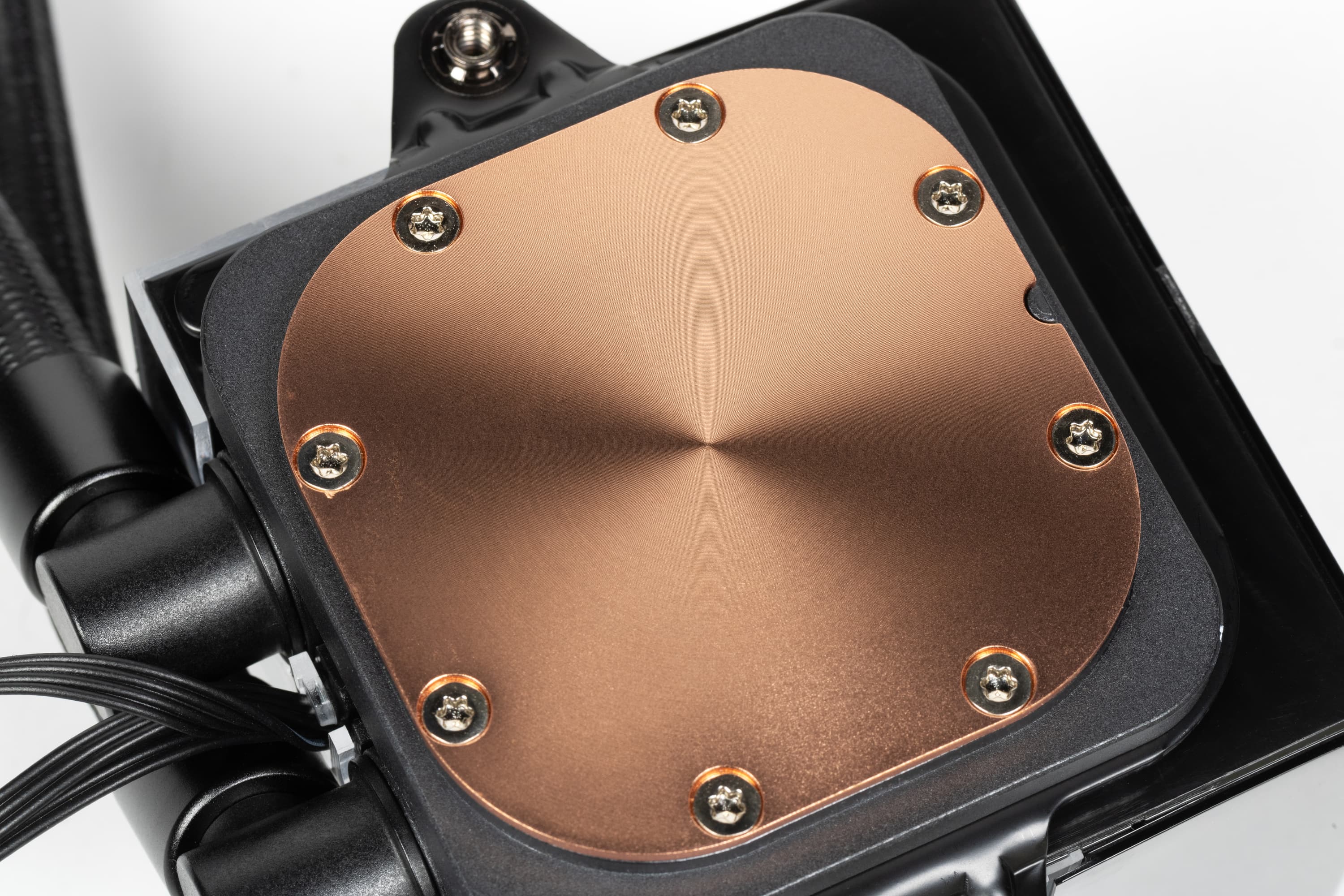 Система герметичная, заправлена, готова к использованию. Помпа интегрирована в один блок с теплосъемником. Подошвой теплосъемника, непосредственно прилегающей к крышке процессора, служит медная пластина. Ее внешняя поверхность ровная, шлифованная и слегка полированная. К центру она выпуклая с перепадом порядка 0,5 мм.