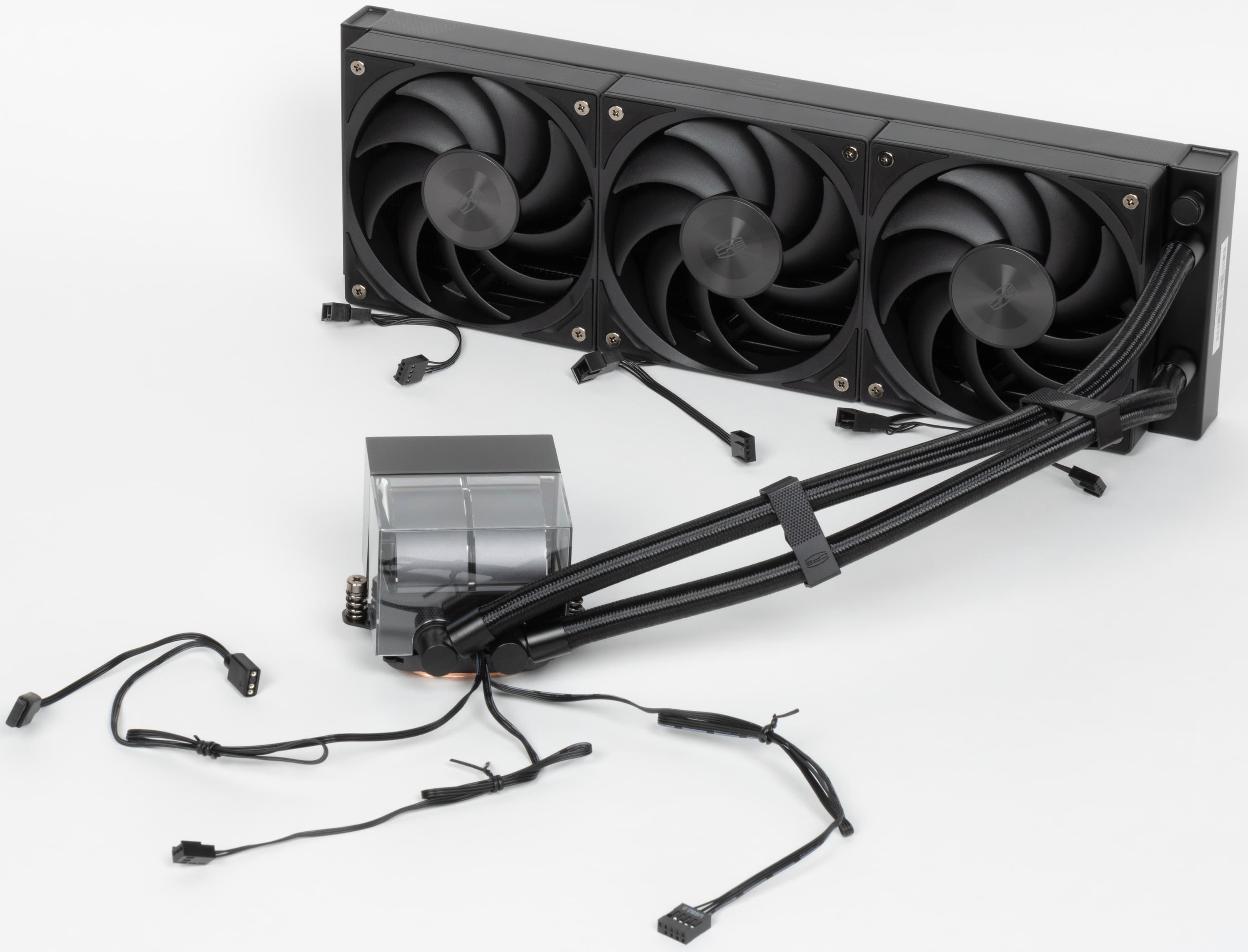 Радиатор изготовлен из алюминия и снаружи имеет матовое черное относительно стойкое покрытие. Максимальная толщина радиатора с закрепленными вентиляторами составляет 54 мм.