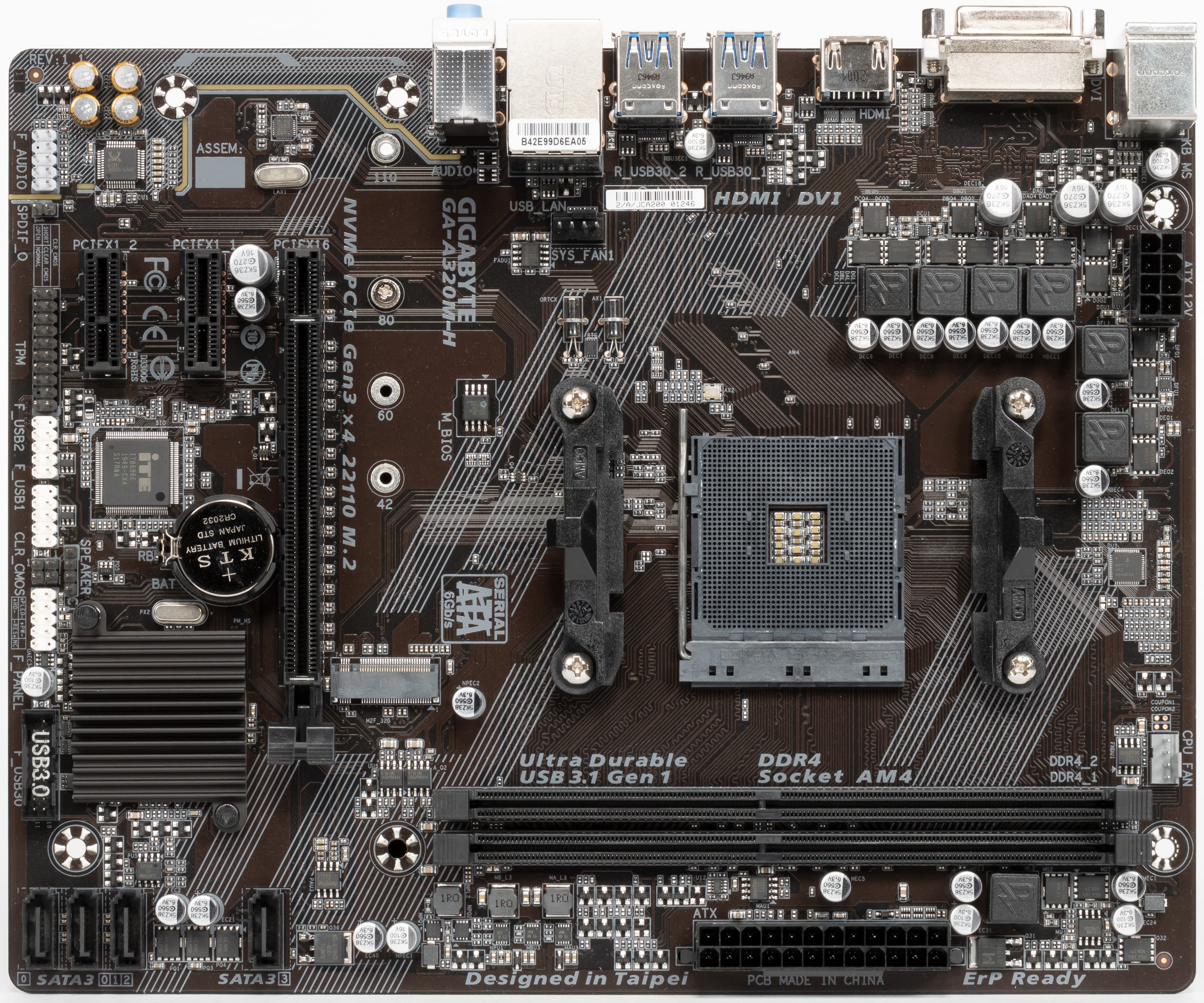 А «совсем бюджетных» плат возьмем две — но фотографии хватит и одной: на самом деле Gigabyte A320M-H и B450M-H только чипсетом и надписями различаются. Есть, кстати, в ассортименте компании уже и A520M-H, и B550M-H — где немного изменилась раскладка слотов, а в остальном... ну вы поняли. Самое смешное, что ни одна из этих плат не имеет ни одного порта USB3 Gen2, хотя один такой есть даже в А320. А вот PCIe Gen4 силами B550M-H поддерживается. В общем, такая своеобразная коллекция, но всегда находящая своего покупателя — благо стоит копейки. И официальными списками совместимости немного удивляет. Например, для A320M-H есть бета-прошивка с поддержкой Ryzen 5 5600X и Ryzen 7 5800X (но Ryzen 9 на Vermeer не поддерживаются, в отличие от Matisse), а также APU Renoir. B450M-H вообще какой-то эталон универсальности — сюда можно устанавливать практически все: от Athlon до Ryzen 9 5950X и Ryzen 7 5700G! По крайней мере, официально не возбраняется — сколько проработает в таком режиме прогнозировать сложно. А как будет работать сразу после сборки — проверить можно. Что мы и сделаем.