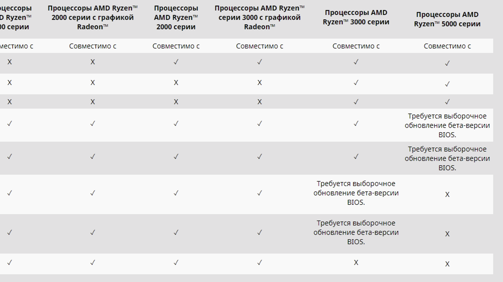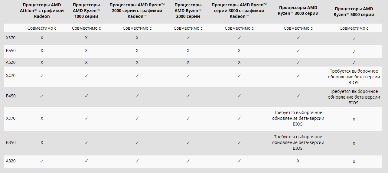 Или нет. Вот так, например, выглядит официальная матрица совместимости от AMD. Частично она не соответствует действительности: например, в большинстве плат на А320 работают Ryzen 3000, хотя утверждается обратное. Дело в том, что до появления A520 (которому немногим более года) другого бюджетного решения у AMD не было, а крупные производители и мелкие сборщики компьютеров предпочитают именно бюджетные чипсеты. Им пришлось идти навстречу. А вот поддержка Ryzen 5000 на 300-й серии чипсетов была официально запрещена AMD. Причем работы в этом направлении велись: ASRock даже успел некоторое количество бета-версий BIOS опубликовать полгода назад, но пришлось включить заднюю. Затем шум немного затих, и для части плат все-таки появились прошивки с поддержкой части процессоров. В каждом конкретном случае изучать вопрос нужно индивидуально — может быть, лично вам повезло. А может быть, и нет.