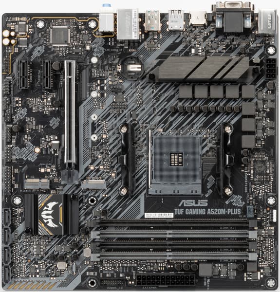 Из ранее не изученного — Asus TUF Gaming A520M-Plus. Чипсет A520 редко обсуждается энтузиастами, поскольку относится к базовой линейке — и, например, разгон процессоров не поддерживает. Кроме того, не поддерживается и PCIe Gen4 — в этом плане платы ничем не лучше «старых». Лучше тем, что чипсетные линии хотя бы не Gen2 — но их тут самих маловато. С другой стороны, установить какой-нибудь SATA-контроллер на ASM1064 сюда можно — и каждый из четырех его портов будет работать на полной скорости, а не ограничиваясь 400 МБ/с, как на В450. Вот и выходит, что лучше всего чипсет подходит для компактных систем на APU серий 4000 и 5000, где все возможности чипсета соответствуют возможностям процессоров, но не более того. Тем более, платы бывают разными — конкретно эта модель не бюджетная, так что система питания процессора, например, мощнее, чем на TUF X470-Plus Gaming.