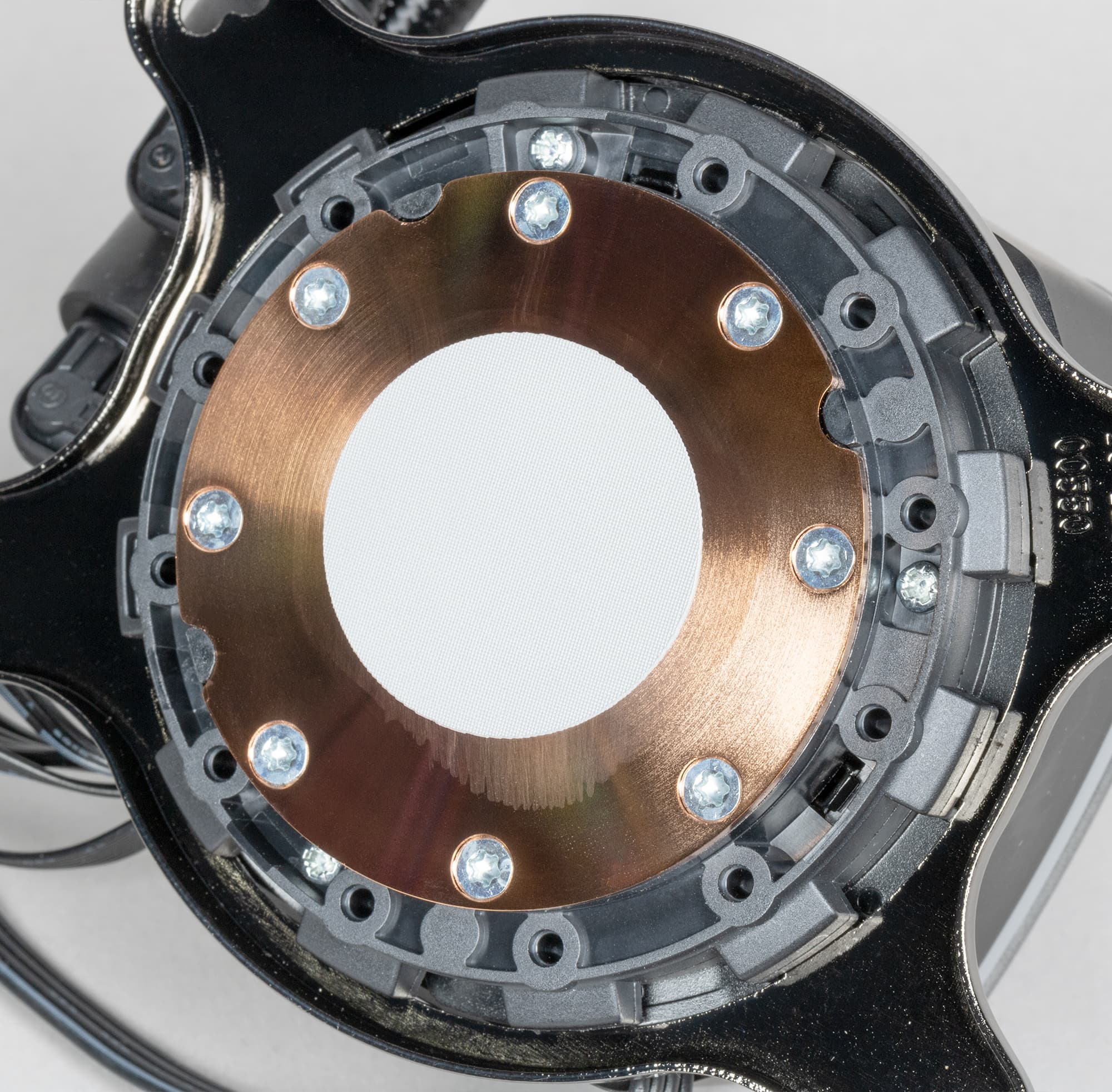 Диаметр этой пластины — 54,5 мм, а внутренняя часть, ограниченная отверстиями, имеет диаметр примерно 44 мм. Ее центральную часть занимает нанесенная тонким слоем термопаста.