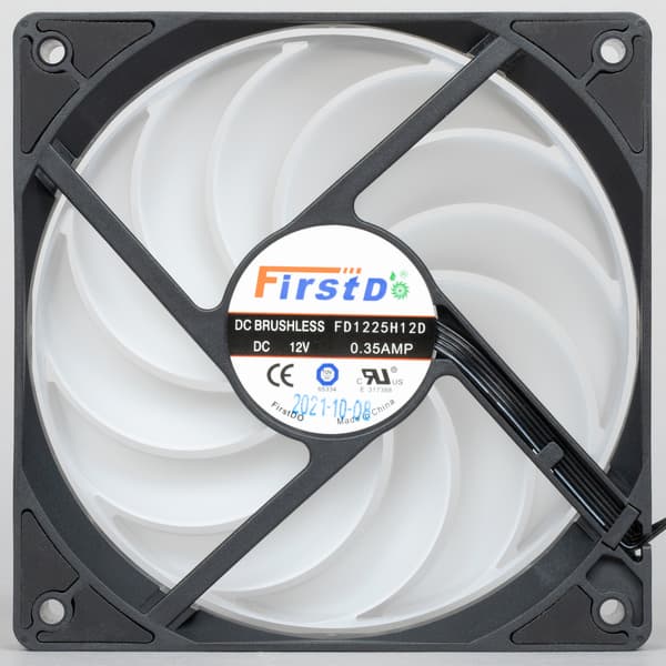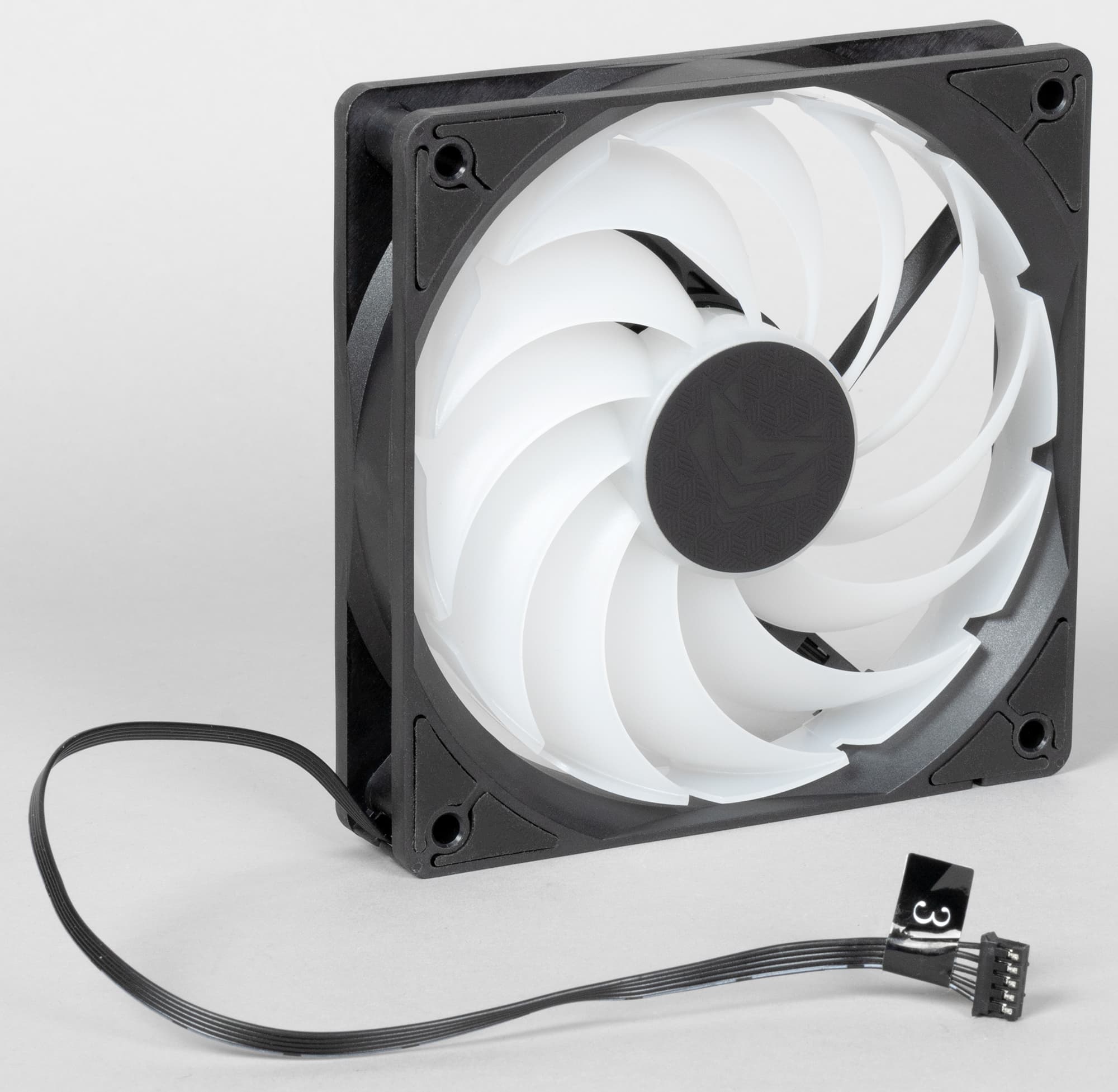 Лопасти крыльчатки заключены в кольцо, что может повышать эффективность вентилятора. Крыльчатка вентилятора изготовлена из белого полупрозрачного пластика. На статоре вентилятора по окружности размещены ARGB-светодиоды, которые подсвечивают крыльчатку изнутри. В вентиляторе применяются два шариковых подшипника, хорошо это или плохо — не очевидно, так как срок службы подшипника зависит от качества изготовления, а не от типа.