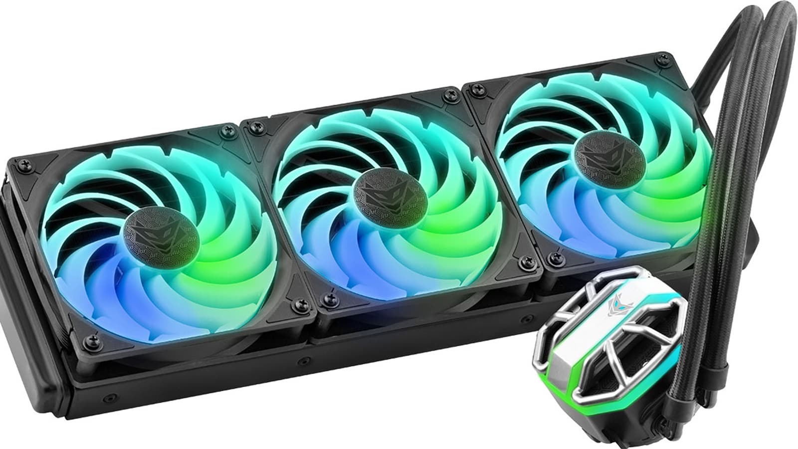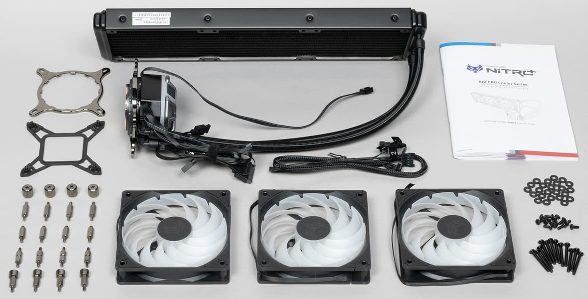 На основе системы жидкостного охлаждения Sapphire Nitro+ S360-A можно создать условно бесшумный компьютер (уровень шума 25 дБА и ниже), оснащенный процессором типа Intel Core i9-7980XE (Intel LGA2066, Skylake-X (HCC)), если потребление процессора под максимальной нагрузкой не будет превышать 245 Вт, а температура внутри корпуса не повысится выше 44 °C. Любители моддинга оценят многоцветную и многозонную статическую или динамическую подсветку вентиляторов и помпы, имеющую стандартное трехконтактное подключение. Среди прочих достоинств отметим хорошее качество изготовления, оплетку шлангов, подключение питания вентиляторов и подсветки к разъему питания SATA и довольно длинные шланги. К особенностям относятся нестандартные разъемы вентиляторов и подключение всех внешних устройств только к помпе.