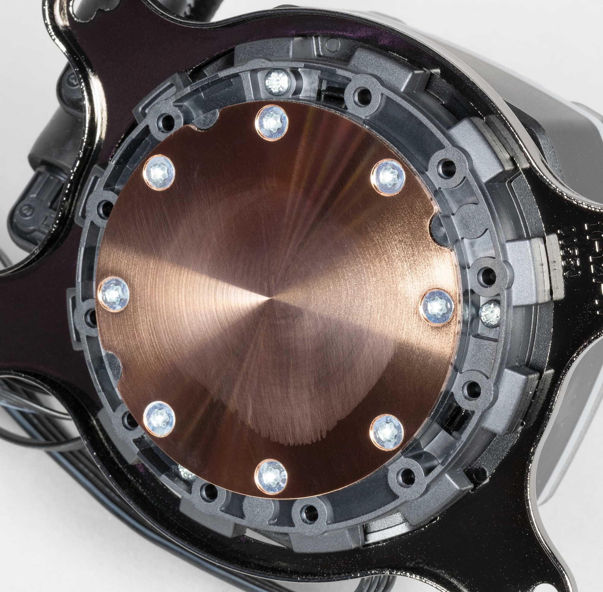 Система герметичная, заправлена, готова к использованию. Помпа интегрирована в один блок с теплосъемником. Подошвой теплосъемника, непосредственно прилегающей к крышке процессора, служит медная пластина. Ее внешняя поверхность ровная, шлифованная и слегка полированная. К центру она выпуклая с перепадом порядка 0,3 мм.