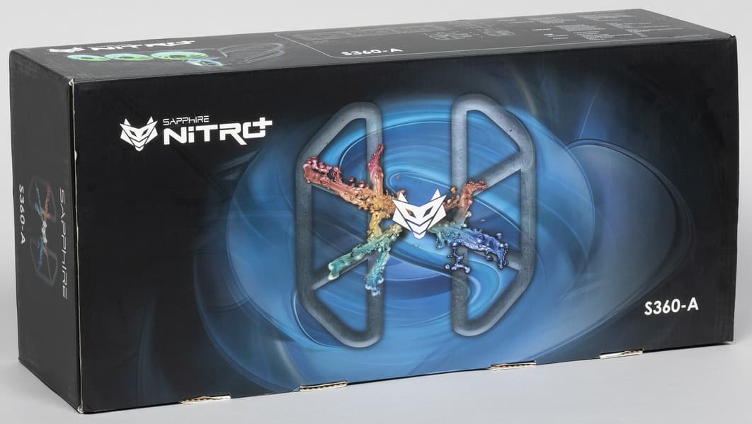 Поставляется система жидкостного охлаждения Sapphire Nitro+ S360-A в коробке из среднего по толщине гофрированного картона. Оформление коробки красочное. На внешних плоскостях коробки в цвете изображен сам продукт, а также перечислены технические характеристики, есть и чертежи помпы и радиатора с главными размерами. Надписи на английском языке. Для защиты и распределения деталей используются форма из папье-маше, чехлы из тонкого картона и пластиковые пакеты. Подошва теплосъемника и термопаста на ней, а также радиатор с одной стороны защищены накладками из прозрачного пластика.